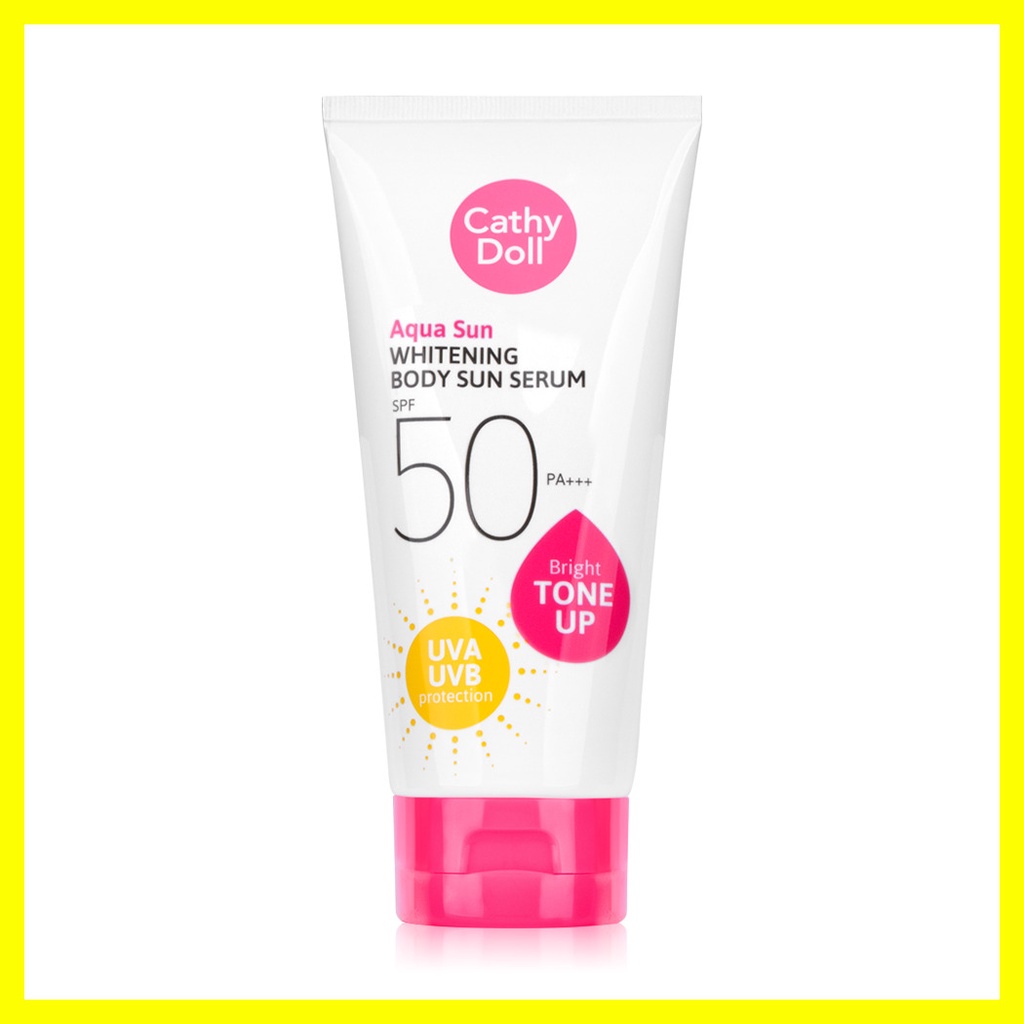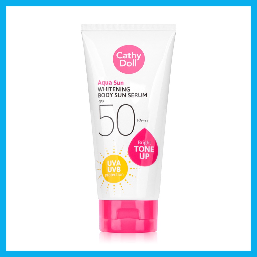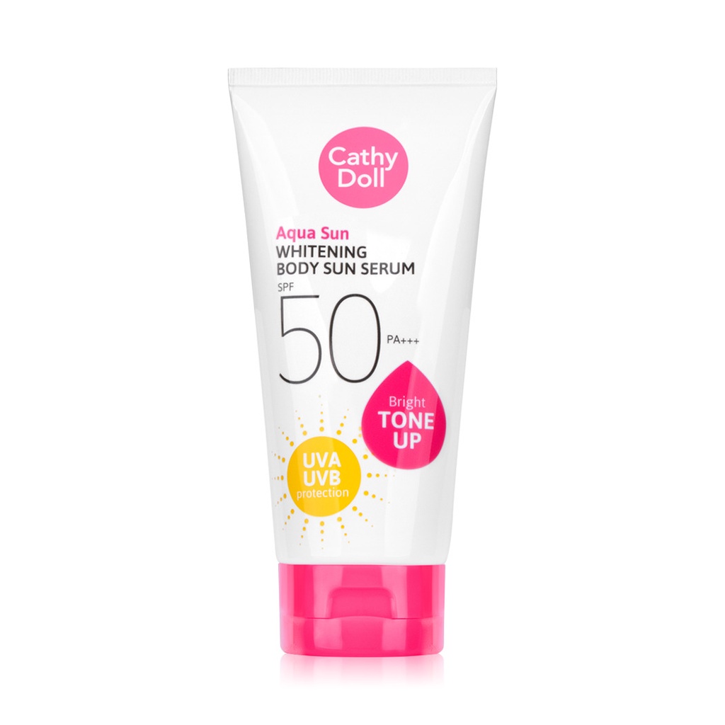Cathy Doll Aqua Sun Whitening Body Sun Serum SPF50/PA+++ 138ml (Y2022)กันแดดอควาสูตรผิวไบร์ทจาก Cathy Doll ที่สามารถปรับสีผิวให้กระจ่างใสขึ้นทันทีที่ใช้ ด้วยอนุภาคพิเศษของเนื้อเจลที่แตกตัวเป็นเซรั่มน้ำแร่ มีความบางเบา ไม่เหนอะหนะ เกลี่ยง่าย ซึมซาบเร็ว ป้องกันแสงแดดมากถึง 50 เท่า ผสานคุณค่าจาก Magnesium Ascorbyl Phosphate อนุพันธ์วิตามินซีที่มีประสิทธิภาพสูง ช่วยปรับผิวสว่างกระจ่างใส วิตามินบี 3 ช่วยลดการสร้างเม็ดสีเมลานิน ผลลัพธ์รอยดำ ความหมองคล้ำ แลดูจางลง Jania rubens ช่วยปลุกผิวสดชื่น และ Titanium Dioxide ช่วยปกป้องผิวจากแสงแดดยาวนาน ไม่ว่าจะทำกิจกรรมกลางแจ้งหรือเจอแดดแรงแค่ไหนก็เอาอยู่• เนื้อครีมแตกตัวเป็นเซรั่ม บางเบา เกลี่ยง่าย ไม่เหนอะหนะ