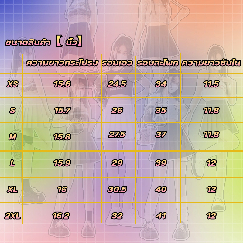 X S:ความยาวกระโปรง 15.6 นิ้ว รอบเอว24.5 นิ้ว รอบสะโพก34 นิ้ว ความยาวซับใน11.5 นิ้ว