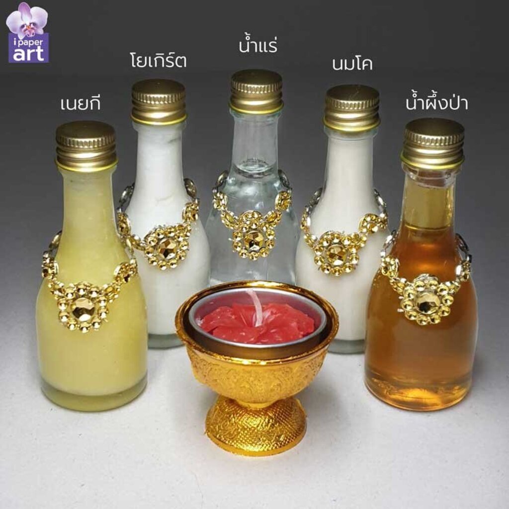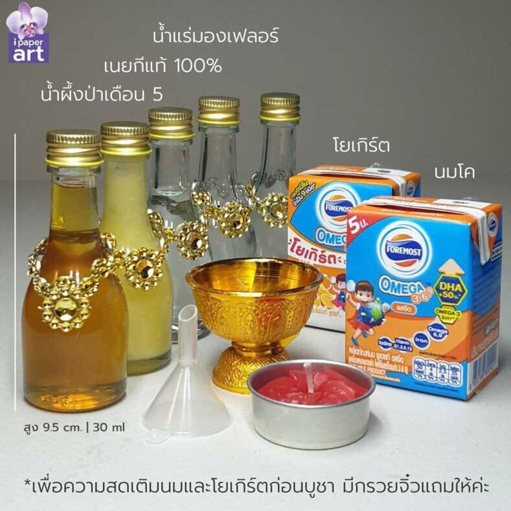 - ขวดแก้ว 5 ใบบรรจุของเหลว 5 อย่าง ขนาด 30 ml | 9.5 x 3.5 x 3.5 เซนติเมตร | นมและโยเกิร์ตเปิดบรรจุลงขวดด้วยตนเองก่อนถวาย มีกรวยและจุกปิดขวดแถมไปด้วย (พานทองเหลืองรองขวด5ขวดในภาพเป็นอุปกรณ์ประกอบตัวอย่างการจัดวาง ไม่ใช่สินค้าในชุด)