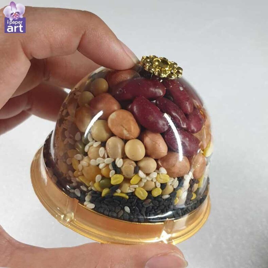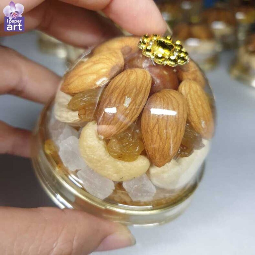 - โดม M พร้อมพานจิ๋วจำนวน 3 พาน (พานแยกจากตัวโดม) ขนาดบรรจุของแห้ง 50 ml | 8.5 x 6 x 6 เซนติเมตร (รวมความสูงพร้อมพาน)