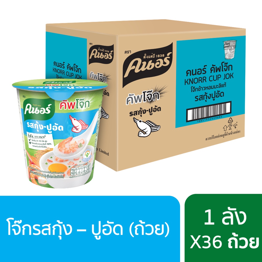 [ส่งฟรี] Knorr cup jok 32 g. x36คนอร์ คัพโจ๊ก แบบถ้วย32 กรัม (1ลัง 36 ถ้วย) - รสกุ้ง-ปูอัด