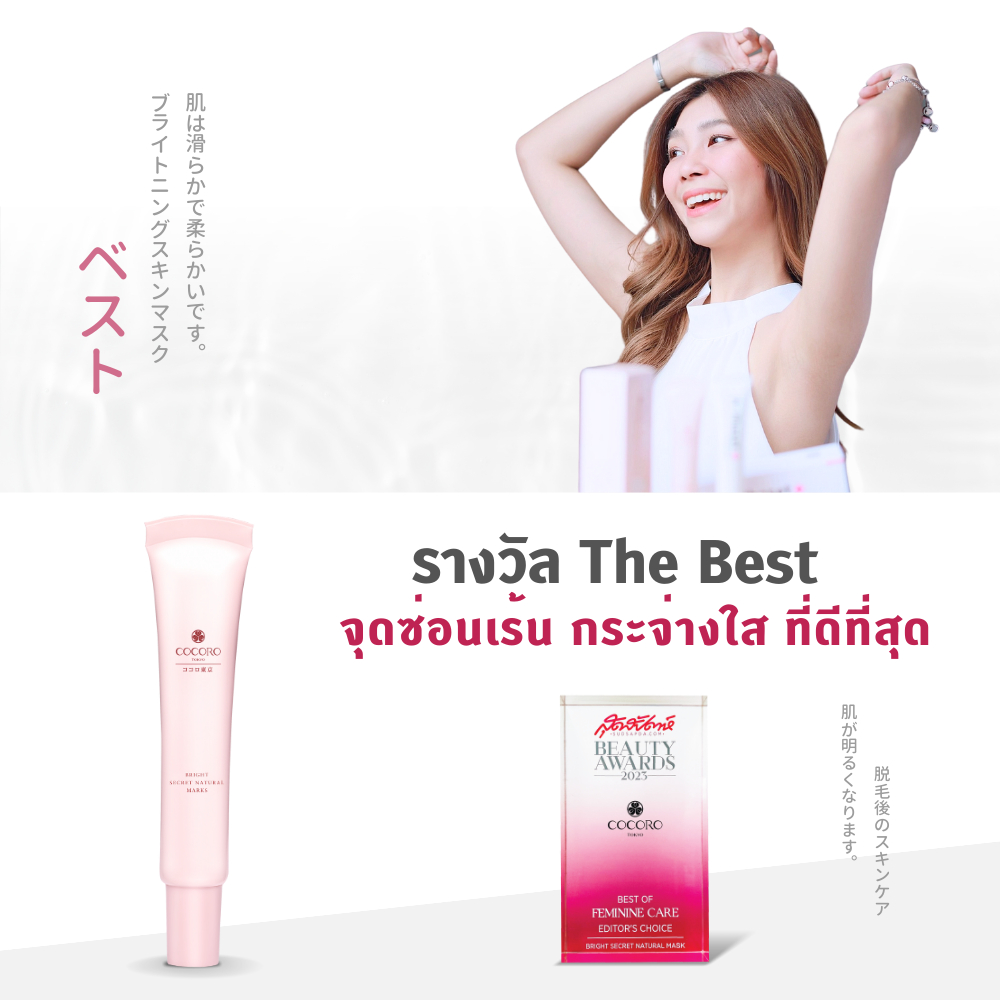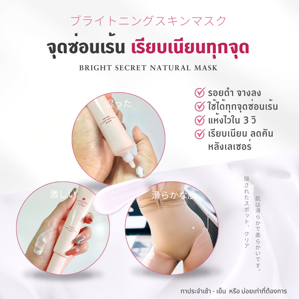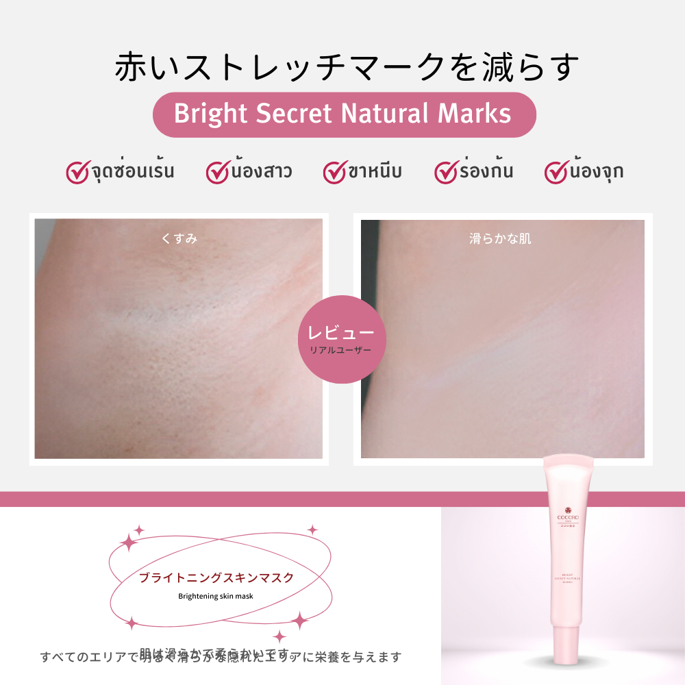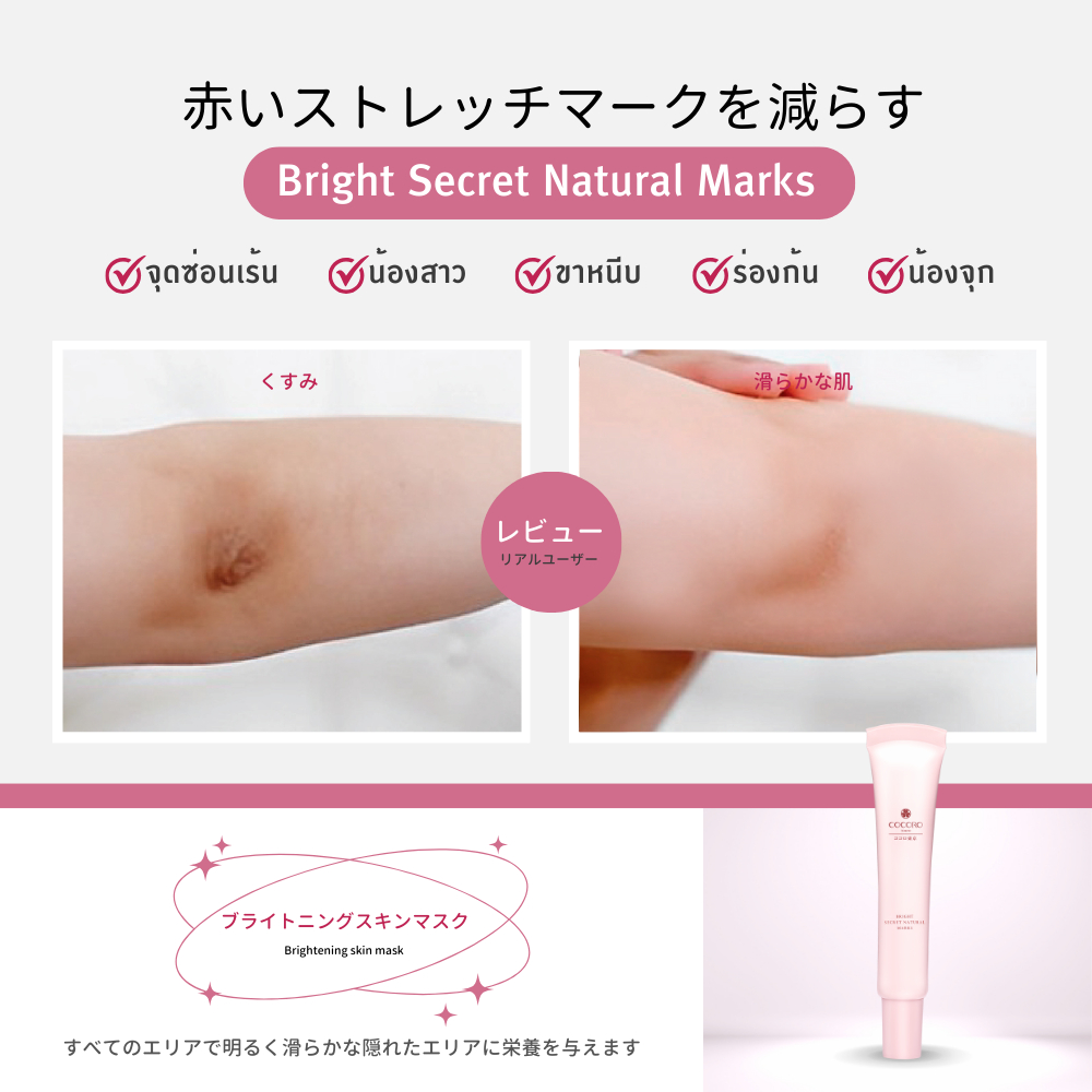 COCORO TOKYO Bright Secret Natural Mask 30 ml. 1 หลอดผลิตภัณฑ์เนื้อมาส์กจุดซ่อนเร้นแลดูกระจ่างใส สูตรไม่ต้องล้างออก ทาได้ประจำทุกวันเช้าเย็น ปรับผิวดูสว่าง กระจ่างใส ตั้งแต่ครั้งแรกที่ใช้ อ่นโยนเหมาะกับผิวบอบบาง ผลิตภัณฑ์เพื่อผู้หญิงที่ต้องการดูแลจุดซ่อนเร้นโดยเฉพาะ และเหมาะกับผู้ที่มีปัญหาผิวหมองคล้ำบริเวณต่างๆดังนี้ และอยากให้ผิวและดูกระจ่างใส สามารถทาที่บริเวณ รักแร้ รอยดำฮอร์โมนจากการตั้งครรภ์ ผิวหนังช้าง รอยดำจากน้ำหนักที่เพิ่มขึ้น เช่น บริเวณคอ ขาหนีบ ข้อพับต่างๆ เพียงทา Cocoro Tokyo Bright Secret Natural Marks ในบริเวณที่ต้องการ