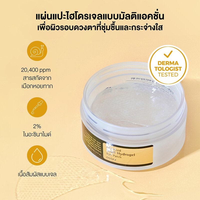 COSRX Advanced Snail Hydrogel Eye Patch 60 Patchesแผ่นไฮโดรเจลสำหรับมาสก์ผิวรอบดวงตาที่ช่วยเติมความชุ่มชื้น อิ่มฟู และเพิ่มความสว่างให้กับบริเวณรอบดวงตาที่บอบบางอย่างเห็นได้ชัด แผ่นมาสก์ประกอบด้วยสองขนาด เล็กและใหญ่เพื่อปลอบประโลมและให้ความชุ่มชื้นแก่ผิวด้วยขนาดที่พอดีคุณสมบัติโดดเด่น