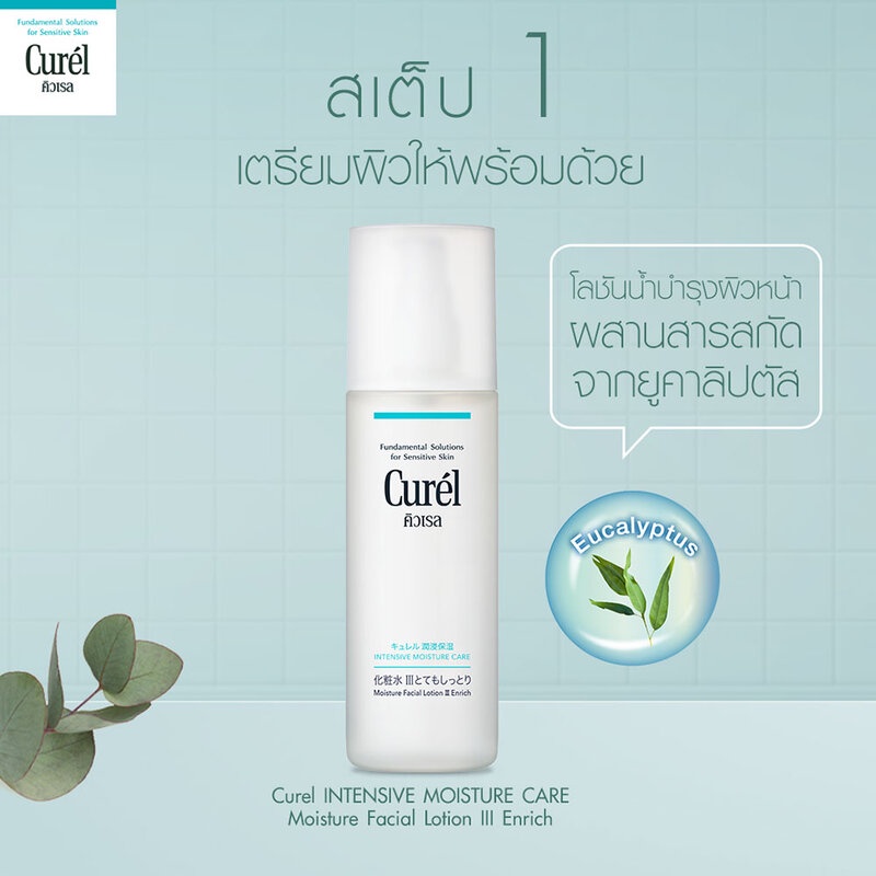 Curel Intensive Moisture Care Moisture Facial Lotion III Enrich 30ml โลชั่นน้ำบำรุงผิวหน้า สำหรับผิวบอบบางแพ้ง่าย ใช้เป็นขั้นตอนแรก เพื่อเสริมการทำงานของครีมบำรุงในขั้นตอนถัดไป ผสานสารสกัดจากยูคาลิปตัส กระตุ้นให้ผิวสร้างเซราไมด์ตามธรรมชาติ รู้สึกผิวนุ่มชุ่มชื้น และลดการระคายเคืองจากผิว