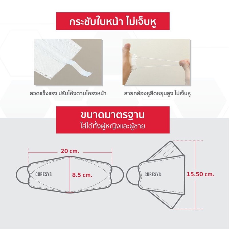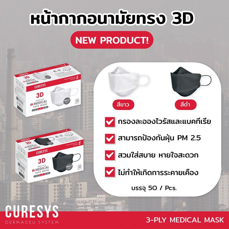 Cr.facebook.com/curesysthailandCURESYS 3D Premium Medical Face Mask 50pcs #Black หน้ากากอนามัยทางการแพทย์ สีดำ 50 ชิ้น ทรง 3D สวมใส่สบาย กระชับหน้า หายใจสะดวก สายคล้องหูนุ่ม ไม่เจ็บ พร้อมแผ่นกรอง 3 ชั้น ประสิทธิภาพการป้องกันสูงสุด 99% กรองได้ทั้ง ไวรัส แบคทีเรีย และฝุ่น PM 2.5 เนื้อสัมผัสนุ่มละเอียดอ่อนโยน เจ้าเดียวในไทยที่ได้รับการรับรองว่าไม่ก่อให้เกิดการระคายเคือง อันเป็นสาเหตุของสิว