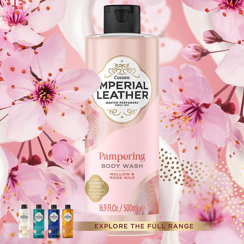 Cr. imperialleather.co.uk• Cussons Imperial Leather Pampering Body Wash Mallow & Rose Milk 500ml ปรนนิบัติผิวให้ นุ่ม หอม น่าสัมผัส ยกระดับการอาบน้ำในทุกวันด้วยเจลอาบน้ำ ห่อหุ้มผิวด้วยเอสเซนเชียลออยล์ สูตรเฉพาะของราชวงศ์ให้ฟองโฟมเนียนนุ่ม เพื่อสัมผัสที่พิเศษเหนือกาลเวลา เคลิบเคลิ้มด้วยกลิ่นหวานละมุนของวานิลลาเมอแร็งก์ และกุหลาบ ที่แทรกเบาๆ ด้วยกลิ่นผลไม้ให้สัมผัสของหญิงสาวด้วยกลิ่นหอมหวานจากมัสค์และมาร์ชแมลโลว์ พร้อมเติมความหรูหราด้วยกลิ่นจากไม้หอม
