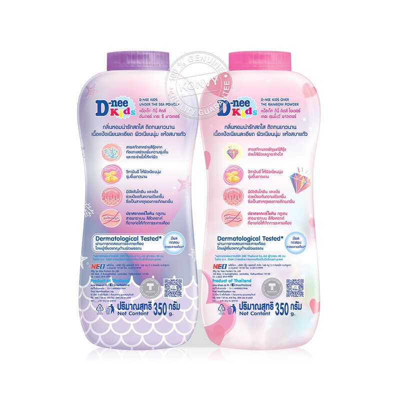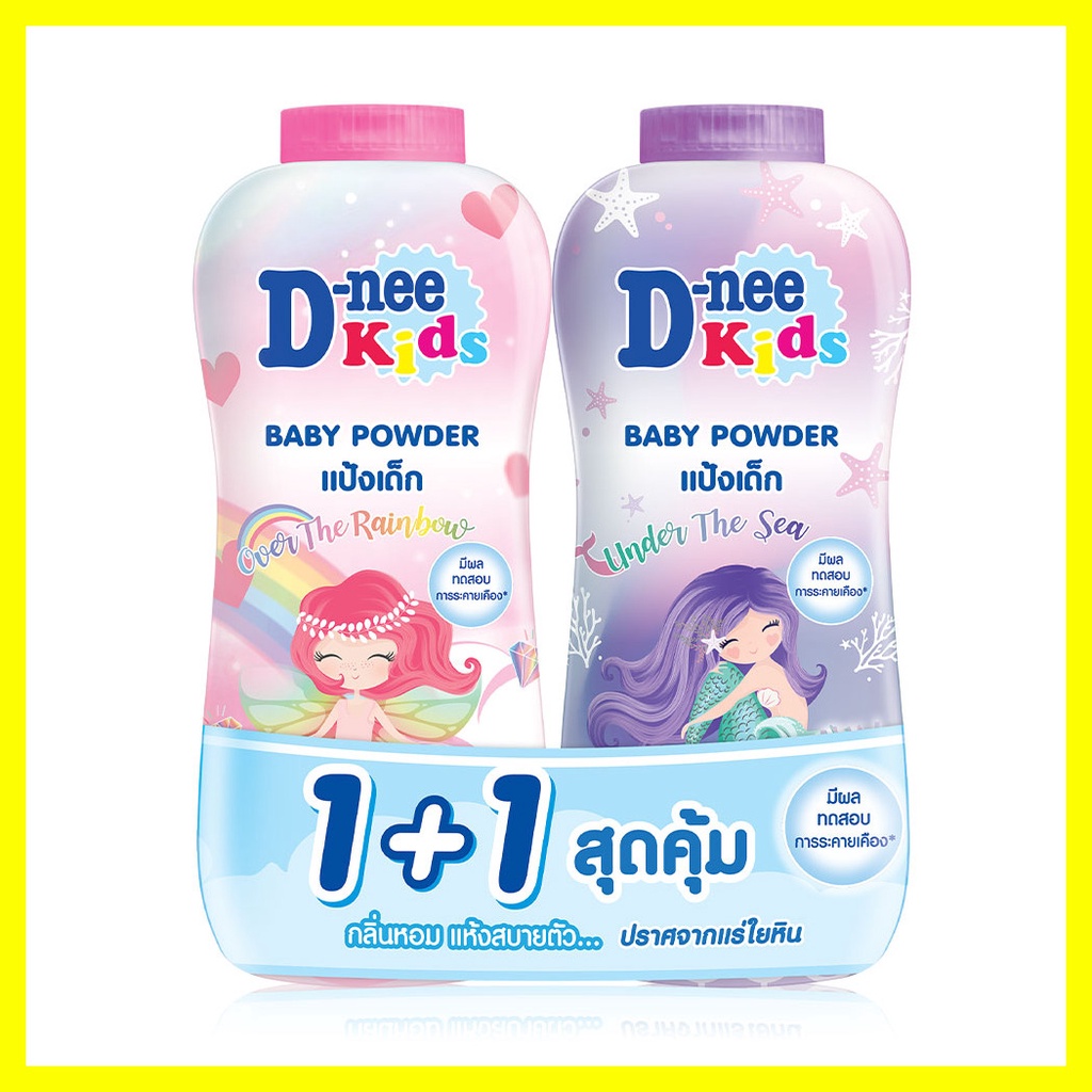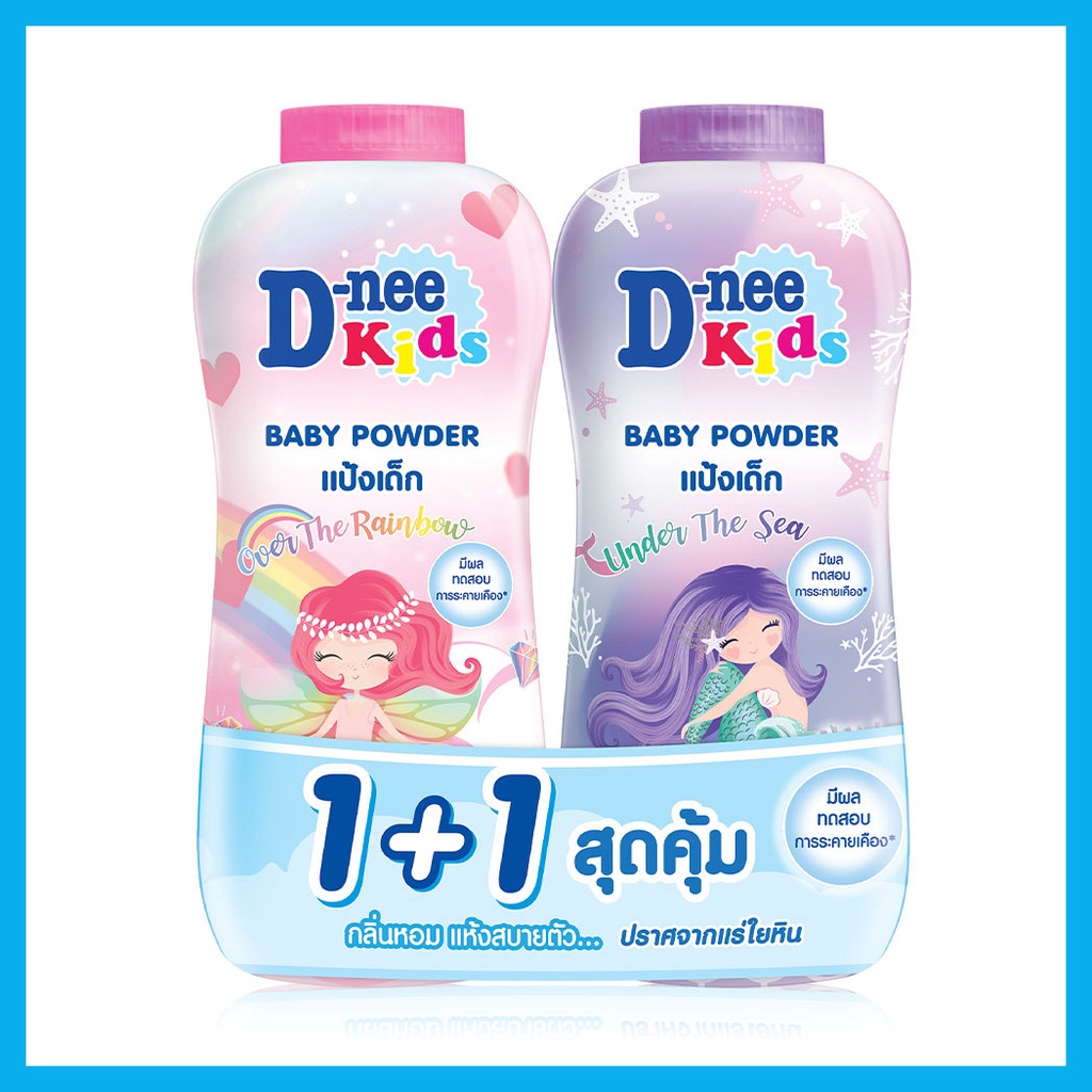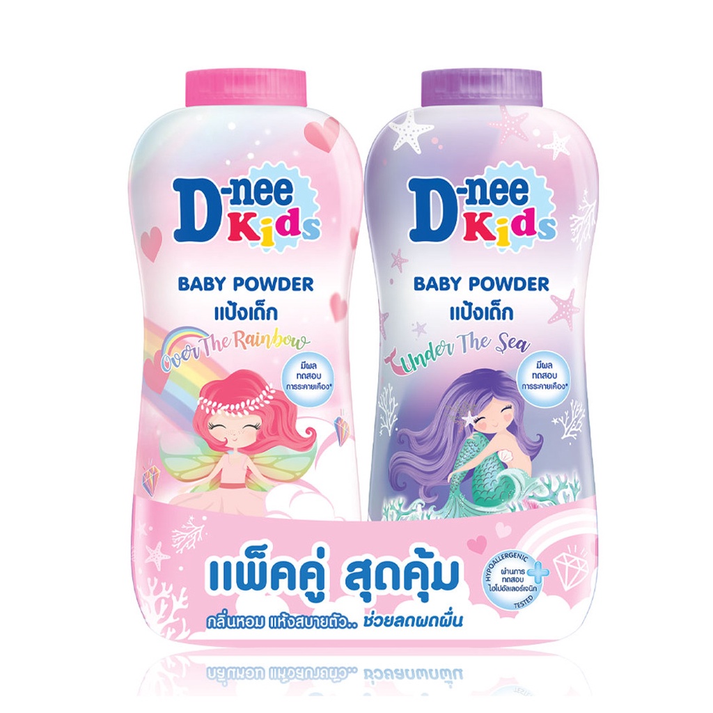 D-nee Kids Baby Powder Over The Rainbow With Under The Sea Pack [350mlx2pcs]แป้งเด็ก กลิ่นหอมหวาน หอมสดใส เนื้อแป้งเนียนละเอียด บริสุทธิ์จากธรรมชาติ ปราศจากสี อ่อนโยนด้วยสารสกัดบริสุทธิ์จากธรรมชาติ จึงใช้ได้บ่อยตามที่ต้องการ ช่วยให้ลูกน้อยสัมผัสแห้งสบายผิวตลอดวัน คงความสมดุลของผิว ให้ผิวลูกเนียนนุ่ม น่าสัมผัส• ปราศจากกลูเตน แร่ใย่หินและสารพาราเบน