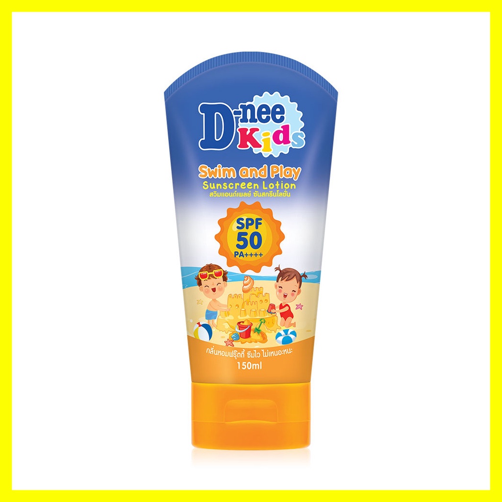 D-nee Kids Swim & Play Sunscreen Lotion SPF50/PA+++ [Frozen Edition] 150ml โลชั่นป้องกันผิวหน้า และผิวกายจากแสงแดดสำหรับเด็กโดยเฉพาะ พร้อมบำรุงผิวด้วยสารกัดจากธรรมชาติ• UVA/UVB Filter ช่วยปกป้องผิวบอบบางจากรังสี UVA และ UVB นานถึง 50 เท่า เพิ่มประสิทธิภาพในการดูแลปกป้องผิวจากแสงแดด
