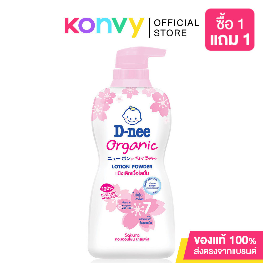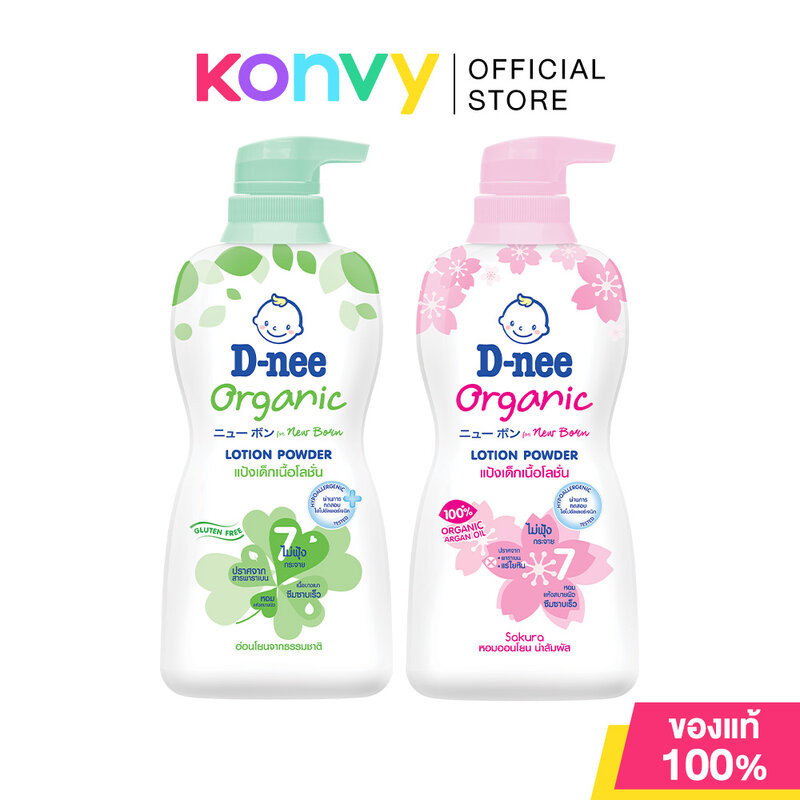 •D-nee New Born Organic Lotion Powder 400ml แป้งเด็กเนื้อโลชั่นสูตรออร์แกนิค ผสานคุณค่าของแป้งเด็กและโลชั่น ให้ผิวเนียนนุ่มชุ่มชื้น พร้อมสัมผัสแห้งสบายตัวแบบแป้งฝุ่นแต่ไม่ฟุ้งกระจาย ไม่รบกวนทางเดินหายใจของลูกน้อย สามารถใช้ได้แม้ในเด็กที่เป็นโรคภูมิแพ้•D-nee New Born Organic Lotion Powder Sakura 400ml แป้งเด็กเนื้อโลชั่น เติมเต็มและกักเก็บความชุ่มชื้น ผสานคุณค่าจากดอกซากุระ วิตามินอี น้ำแร่ธรรมชาติ และออร์แกนิคอาร์แกน ออยล์