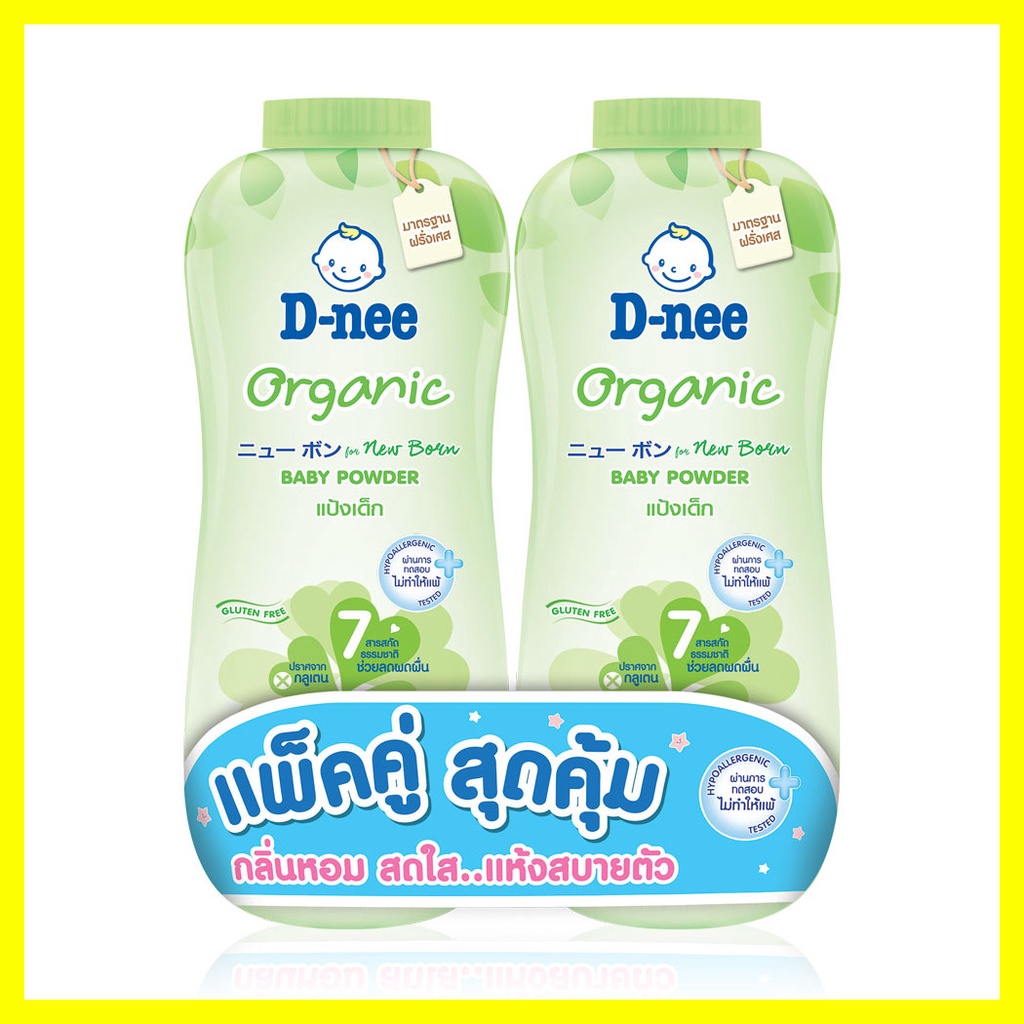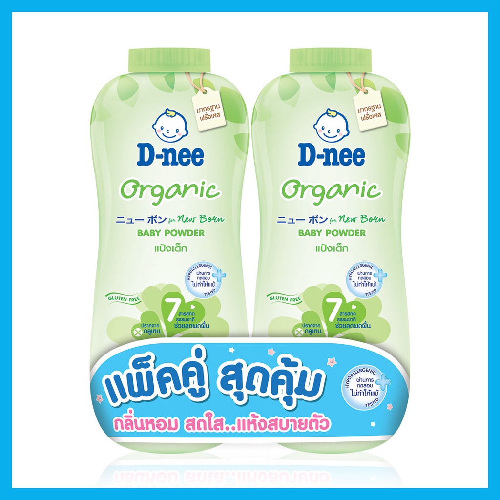 D-nee Organic Baby Powder [350g x 2pcs] #Greenแป้งเด็กสูตรออร์แกนิก เนื้อแป้งเนียนละเอียด สูตรลดฟุ้งสำหรับเด็กแรกเกิดโดยเฉพาะ คงความชุ่มชื้นของผิวด้วยสารสกัดออร์แกนิกข้าวโอ๊ต ดอกคาร์โมมายล์ และน้ำแร่ธรรมชาติ ช่วยให้ลูกน้อยสัมผัสแห้งสบายผิวตลอดวัน และคงความสมดุลของผิว ให้ผิวลูกเนียนนุ่ม น่าสัมผัส• เนื้อแป้งเนียนละเอียด บริสุทธิ์จากธรรมชาติ ปราศจากสี
