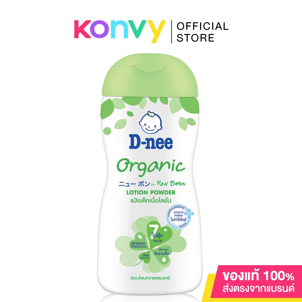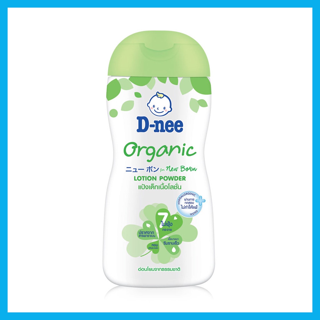 D-nee Organic For New Born Lotion Powder 180ml แป้งเด็กเนื้อโลชั่นสูตรออร์แกนิค ผสานคุณค่าของแป้งเด็กและโลชั่น ให้ผิวเนียนนุ่มชุ่มชื้น พร้อมสัมผัสแห้งสบายตัวแบบแป้งฝุ่นแต่ไม่ฟุ้งกระจาย ไม่รบกวนทางเดินหายใจของลูกน้อย สามารถใช้ได้แม้ในเด็กที่เป็นโรคภูมิแพ้• สูตรอ่อนโยนจากธรรมชาติ ให้กลิ่นละมุนติดตัว