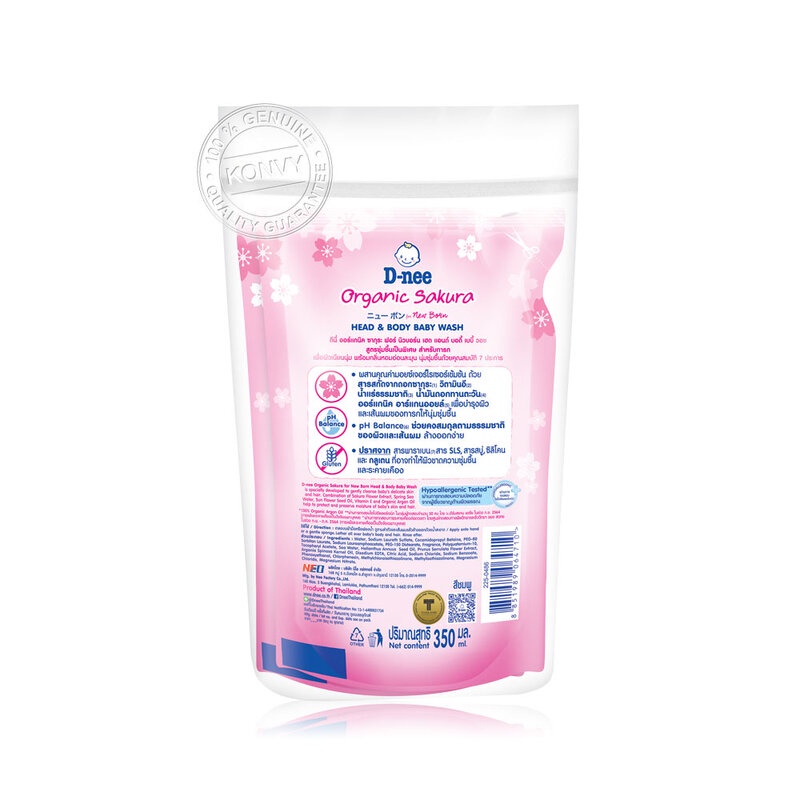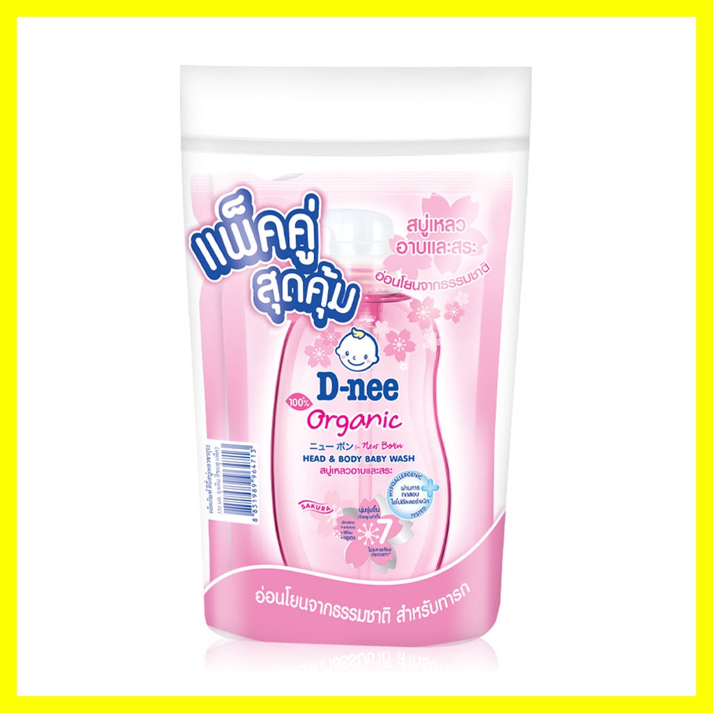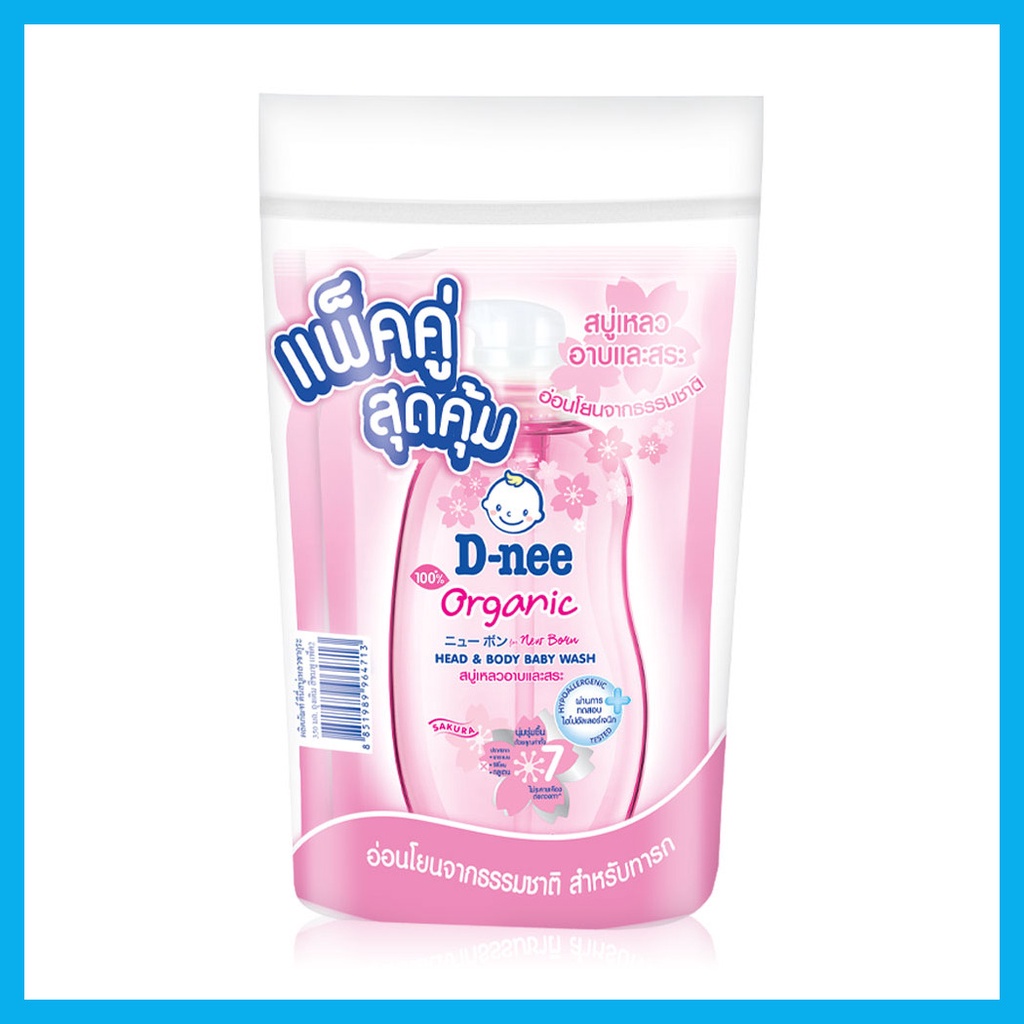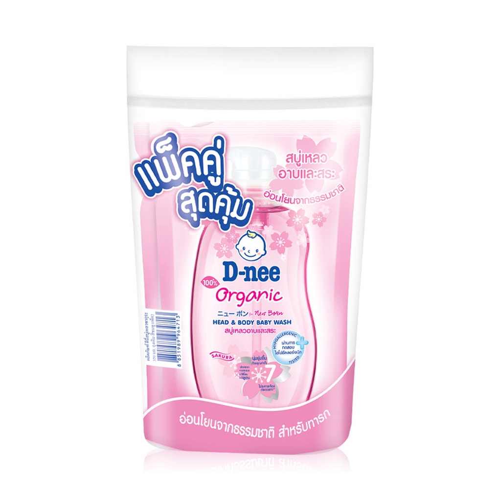 D-nee Organic Head & Body Baby Wash For Newborn [350ml x 2pcs] #Sakuraสบู่เหลวอาบน้ำและสระผม สูตรชุ่มชื้นเป็นพิเศษ สำหรับทารก ช่วยบำรุงผิวและเส้นผม เพื่อผิวเนียนนุ่มน่าสัมผัส พร้อมถนอมผิวอันบอบบางอย่างอ่อนโยน• สารสกัดธรรมชาติจากดอกซากุระ วิตามินอี น้ำแร่ และน้ำมันดอกทานตะวัน ช่วยบำรุงผิวและเส้นผม ให้นุ่มชุ่มชื้นเป็นพิเศษ