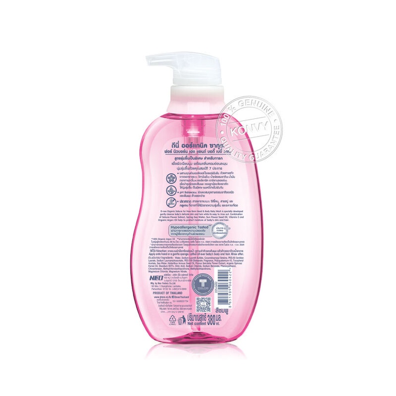 D-nee Organic Head & Body Baby Wash For Newborn 380ml #Sakuraสบู่เหลวอาบน้ำและสระผม สูตรชุ่มชื้นพิเศษ เพื่อผิวเนียนนุ่ม ทำความสะอาดผิวและเส้นผมอย่างอ่อนโยน ล้างออกง่าย พร้อมช่วยเพิ่มความชุ่มชื้นให้ผิวนุ่ม ไม่แห้งตึง ด้วยมอยเจอร์ไรเซอร์เข้มข้น และคุณค่าสารสกัดจากดอกซากุระ วิตามินอี น้ำแร่ธรรมชาติ และน้ำมันดอกทานตะวัน• ผสานคุณค่ามอยเจอร์ไรเซอร์เข้มข้น ด้วยสารสกัดจากซากุระ วิตามินอี น้ำแร่ธรรมชาติ น้ำมันดอกทานตะวัน เพื่อบำรุงผิวและเส้นผม