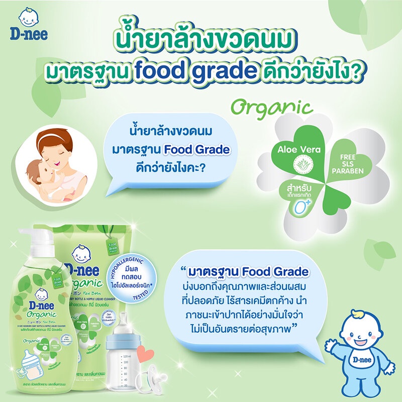 Cr: Facebook.com/DneeThailandD-nee Baby Bottle & Nipple Liquid Cleanser Organic Pouch550mlผลิตภัณฑ์ล้างขวดนม ที่มีส่วนผสมของสารสกัดจากธัญพืชธรรมชาติ ช่วยขจัดคราบโปรตีนของน้ำนมและไขมันที่ติดอยู่ อ่อนโยนไม่ระคายเคือง สามารถใช้ล้างผักและผลไม้ได้