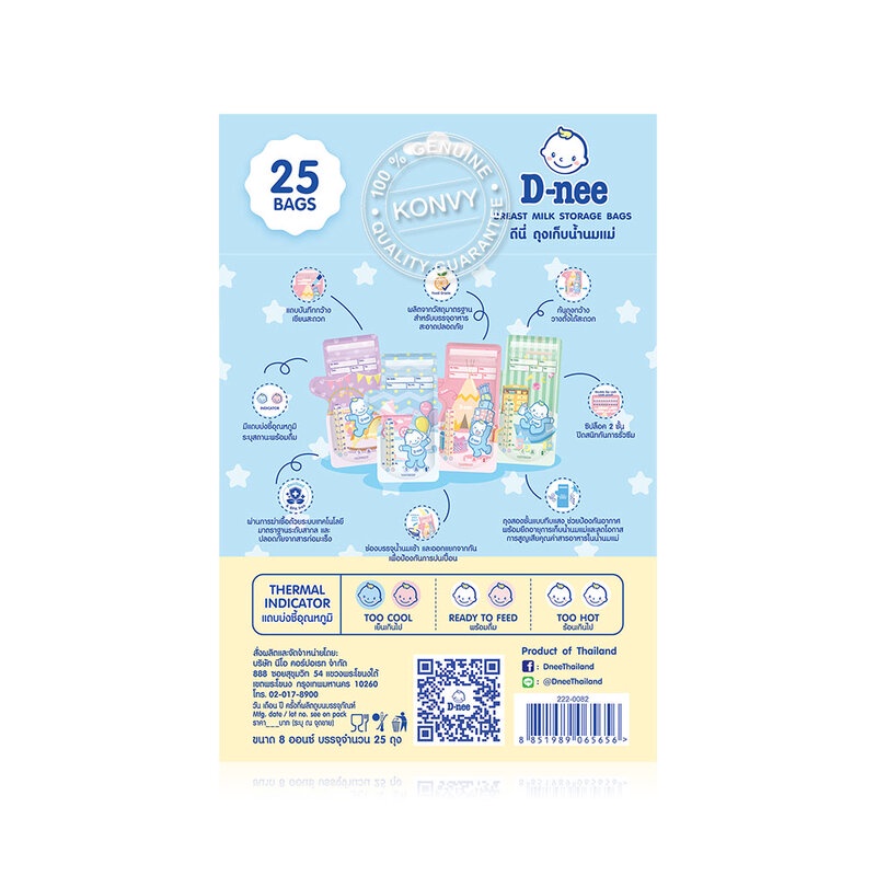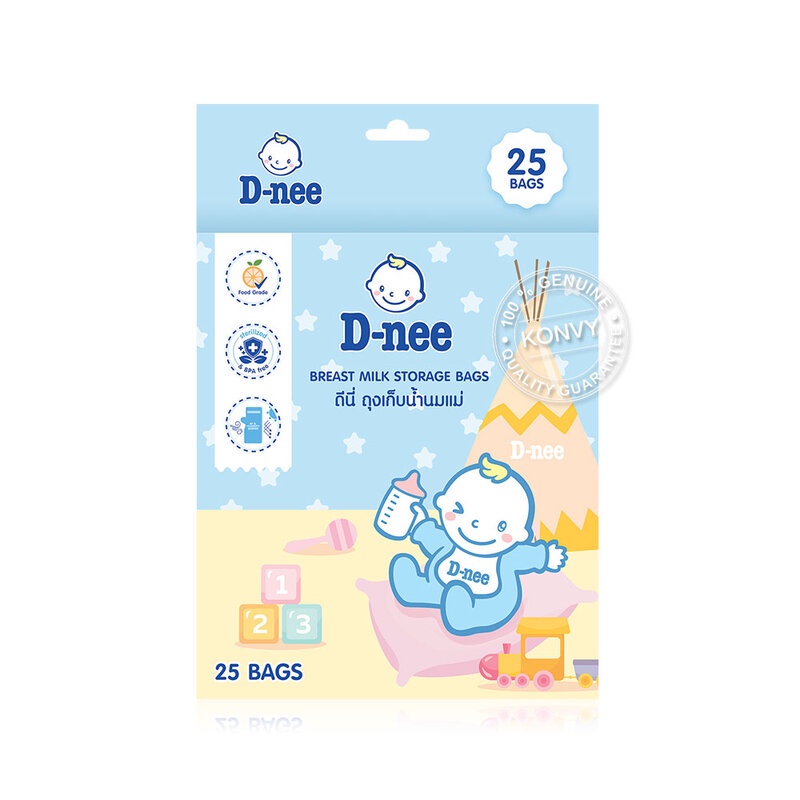 D-nee Breast Milk Storage Bag 25pcs ถุงเก็บน้ำนมแม่ ขนาด 8 ออนซ์ ผลิตจากวัสดุมาตรฐานสำหรับบรรจุอาหาร สะอาดปลอดภัย ซิปล็อค 2 ชั้น ปิดสนิทกันการรั่วซึม ถุงสองชั้นแบบทึบแสง ช่วยป้องกันอากาศ พร้อมยืดอายุการเก็บน้ำนมแม่และลดโอกาสการสูญเสียคุณค่าสารอาหารในน้ำนมแม่ ผ่านการฆ่าเชื้อด้วยระบบเทคโนโลยีมาตรฐานระดับสากล• Double Zipper ไม่รั่วซึมด้วย ซิป 2 ชั้น