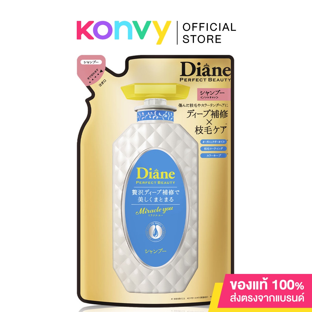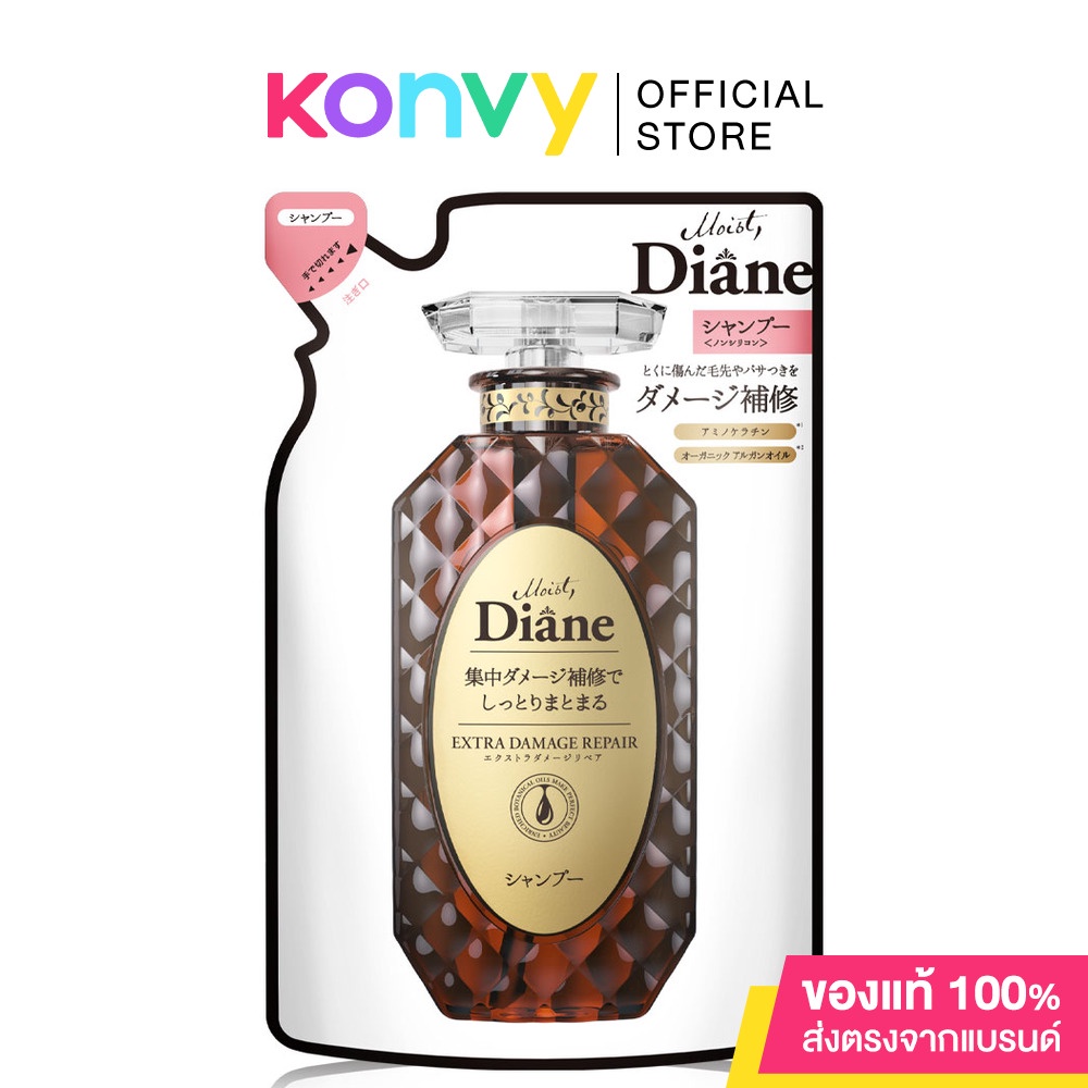 • Moist Diane Extra Damage Shampoo Refill 330ml แชมพูสูตรออยล์ ที่ไม่เหนียวเหนอะหนะ และไม่มีส่วนผสมของซิลิโคน สูตรฟื้นฟูและบำรุงเส้นผมที่แห้งเสีย บำรุงเส้นผมจากภายใน Cactus Seed oil, Baobab oil และ สารบำรุง Hyaluronic acid 3 ชนิดให้ความชุ่มชื่นแก่หนังศีรษะและเคลือบเส้นผมที่แห้งเปราะ ฟองโฟมหนานุ่มจาก Argan Oil และสารสกัดจากพืชพรรณธรรมชาติ 8 ชนิด ซึมซาบสู่หนังศีรษะเพื่อกำจัดความมันและสิ่งสกปรก พร้อมทั้งปกป้องหนังศีรษะในเวลาเดียวกัน เพื่อเส้นผมเงางาม ดูสุขภาพดี• Moist Diane Miracle You Damage Shampoo Refill 330ml แชมพูสระผมสูตรแดเมจ รีแพร์ ด้วยนวัตกรรมใหม่ Polycare® ฟื้นบำรุงและเคลือบผสานเส้นผมที่แตกปลายจากการทำสีให้ประสานกันตั้งแต่ครั้งแรกที่ใช้ พร้อมช่วยลดผมแตกปลายด้วย Organic Ghee Oil และนวัตกรรมสุดพิเศษ ล็อคสีผมด้วยเทคโนโลยี Borealine® พิเศษเฉพาะ Moist Diane ชะลอการเฟดของสีผมจากการสระและแสงแดด