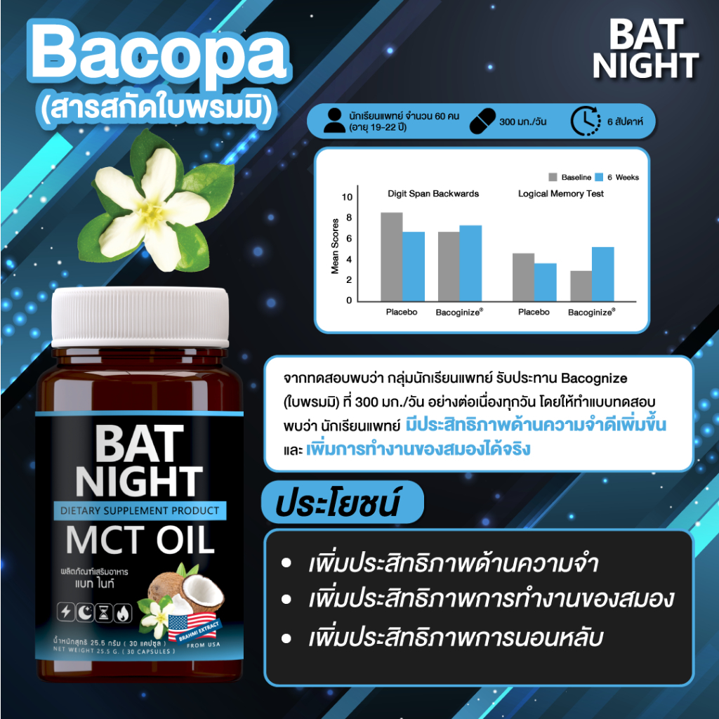 นอกจากนี้มีสารสกัดที่สำคัญ L-Theanine 98% และ สารสกัดใบพรมมิ อยู่ใน #BAT NIGHT ที่มีผลงานวิจัยจากการทดสอบผู้ที่ทาน