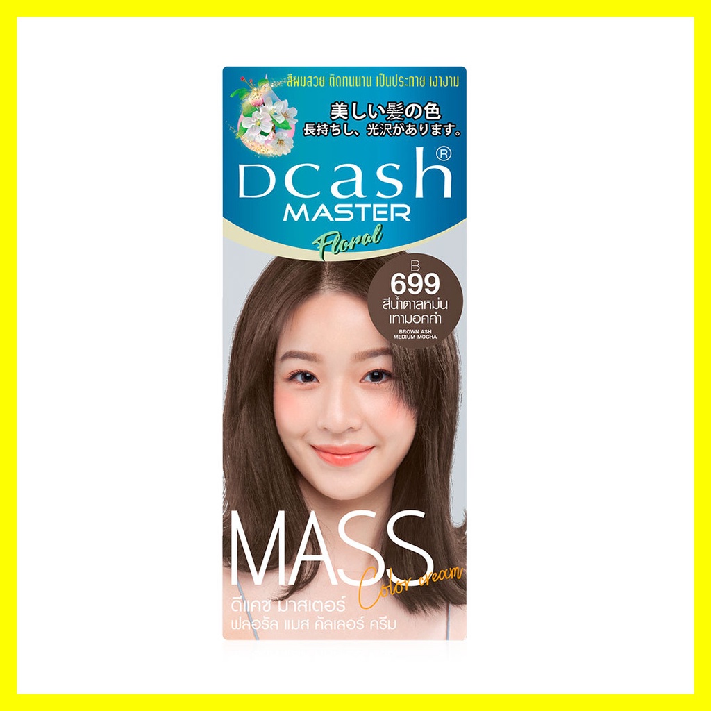 Dcash Master Mass Floral Color Cream 50ml #B699 Brown Ask Medium Mochaครีมเปลี่ยนสีผม สีผมสวยติดทนนานเป็นประกายเงางามมีส่วนผสมของใบมินท์มะลิลดอาการแสบคันบำรุงด้วยอาร์แกนออยล์สีผมเงางามพร้อมสุขภาพผมที่ดีหลังการใช้• สีผมคุณภาพมาพร้อมการบำรุง