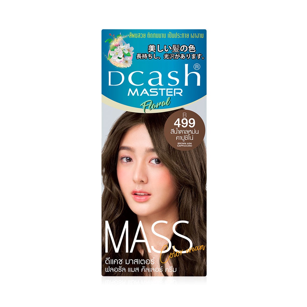 Dcash Master Mass Floral Color Cream 50ml #B499 Brown Ask Cappuccino ครีมเปลี่ยนสีผม สีผมสวย ติดทนนาน เป็นประกาย เงางาม มีส่วนผสมของใบมินท์มะลิ ลดอาการแสบคัน บำรุงด้วยอาร์แกนออยล์ สีผมเงางาม พร้อมสุขภาพผมที่ดีหลังการใช้• สีผมคุณภาพมาพร้อมการบำรุง