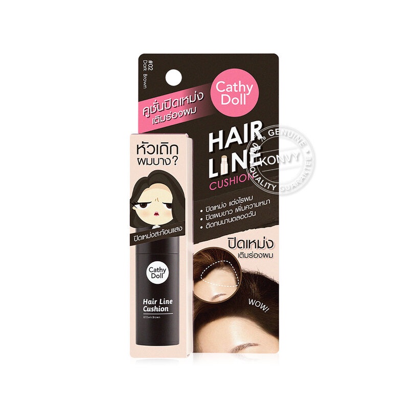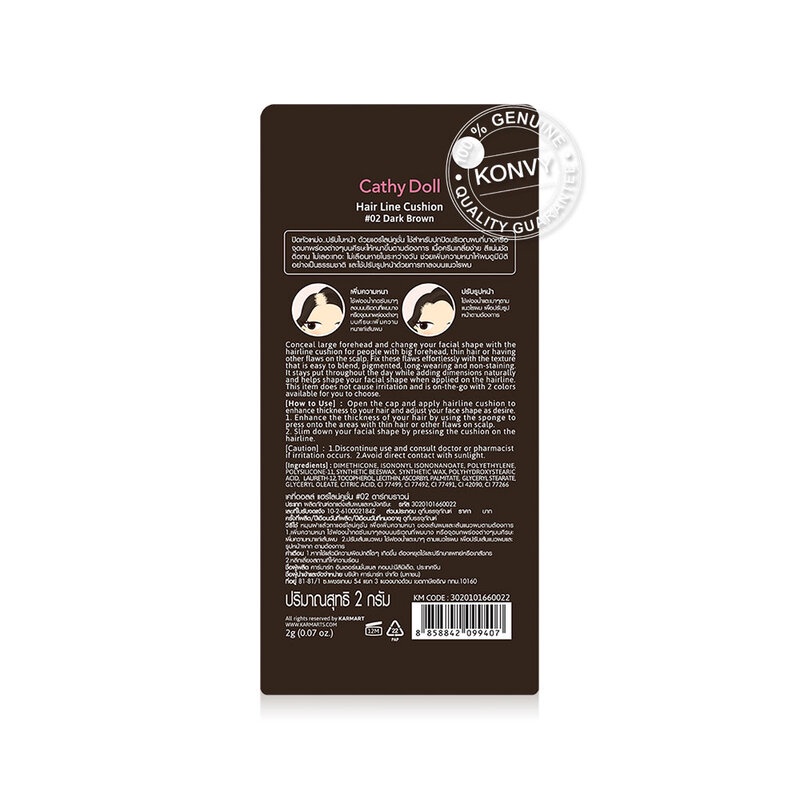 Cathy Doll Hair Line Cushion 2g #02 Dark Brown [Y2022] แฮร์ไลน์คุชชั่น ใช้สำหรับปกปิดบริเวณผมที่บาง หรือจุดบกพร่องต่างๆ บนศีรษะ เนื้อครีมเกลี่ยง่าย สีแน่นชัด ติดทน ไม่เลอะเทอะ ไม่เลือนหายระหว่างวัน ช่วยเพิ่มความหนาให้ผมดูมีมิติ อย่างเป็นธรรมชาติ และใช้ปรับรูปเส้นแนวผมด้วยการทาลงบนแนวไรผม• เนื้อครีมเกลี่ยง่าย สีแน่นชัด ติดทน ไม่เลอะเทอะ ไม่เลือนหายระหว่างวัน
