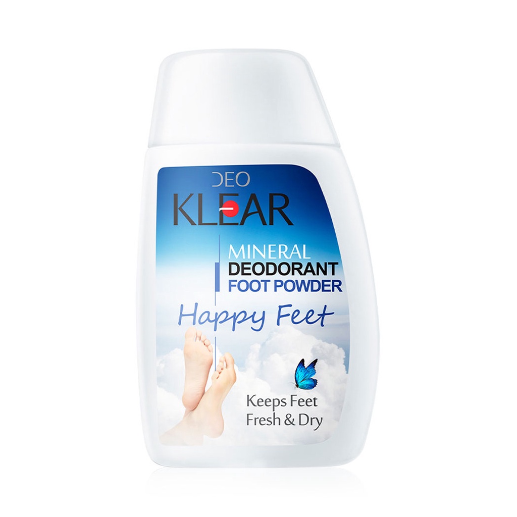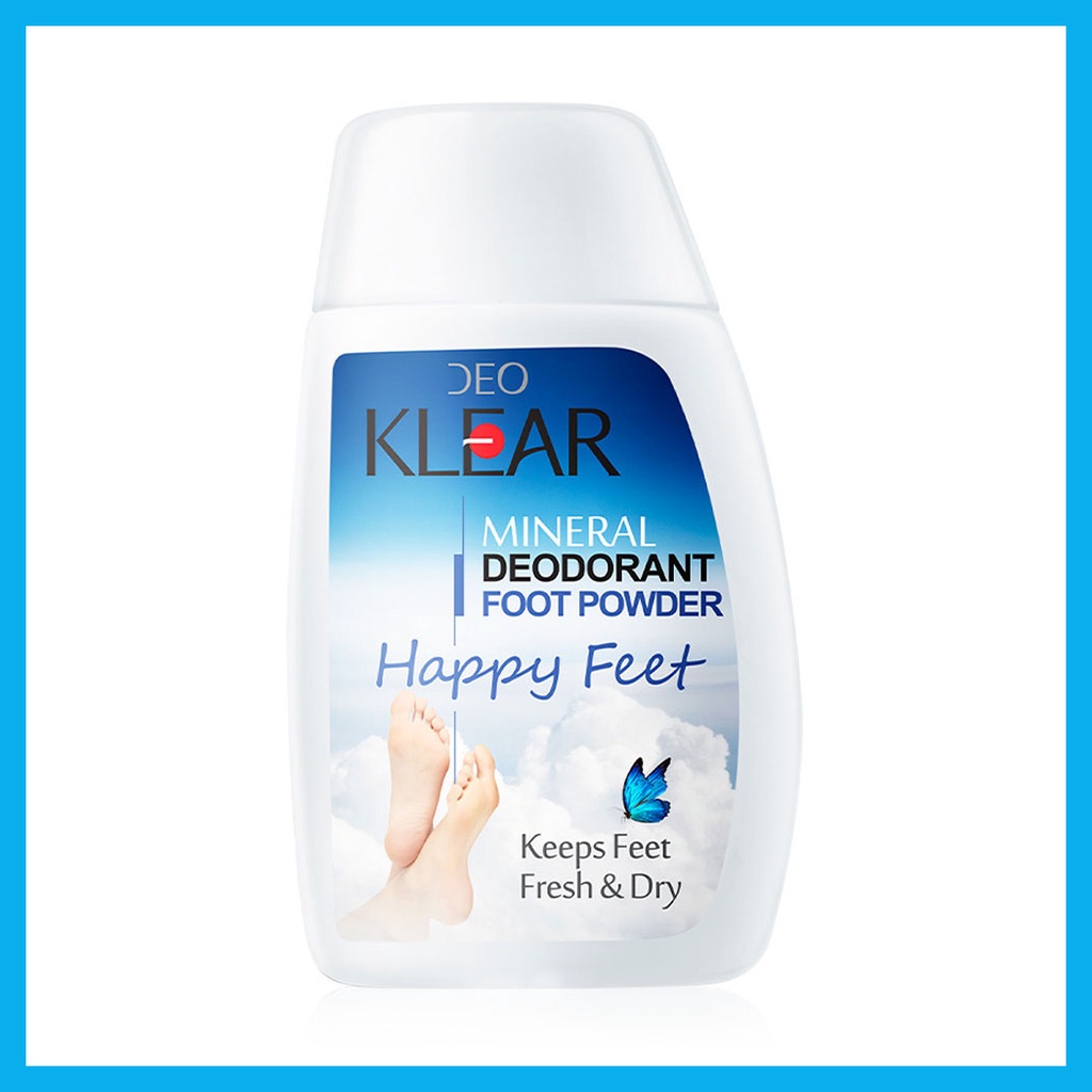 DEOKLEAR Happy Feet Mineral Deodorant foot Powder 50g ดับกลิ่นเท้า แห้งสบายตลอดวันด้วยแป้งที่มีคุณสมบัติของสารส้มในการระงับกลิ่น มอบความแห้งสบาย ช่วยลดการเกิดกลิ่นและแบคทีเรีย• ลดการสะสมของเชื้อแบคทีเรีย