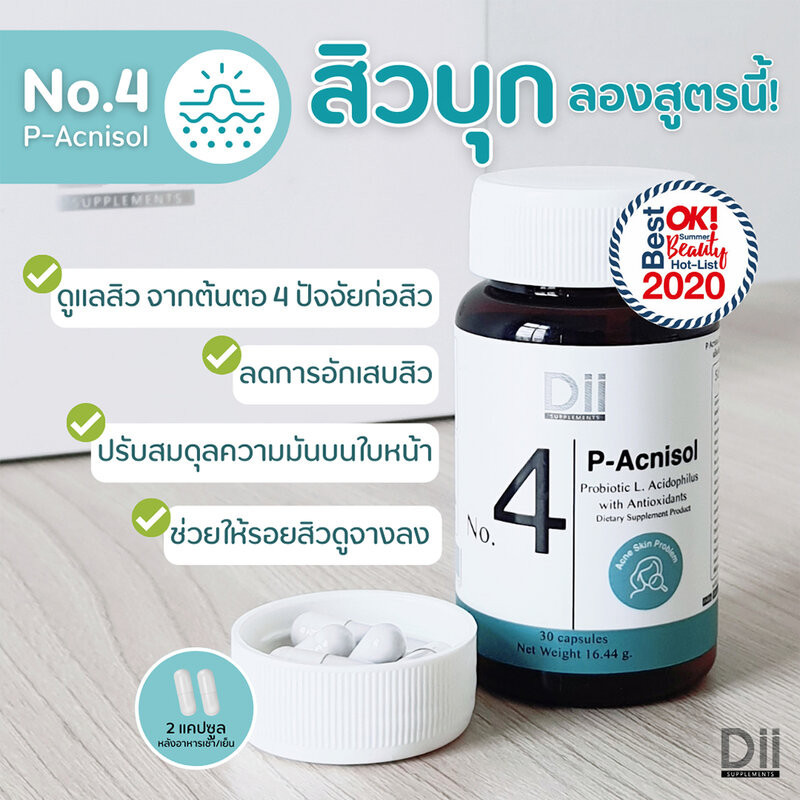 Dii No.4 P-Acnisol 30 Capsules ผลิตภัณฑ์เสริมอาหารสารสกัดจากกีวี่ ข้าวและใบบัวบกผสานคุณค่าของโปรไบโอติกส่วนประกอบใน 1 แคปซูล