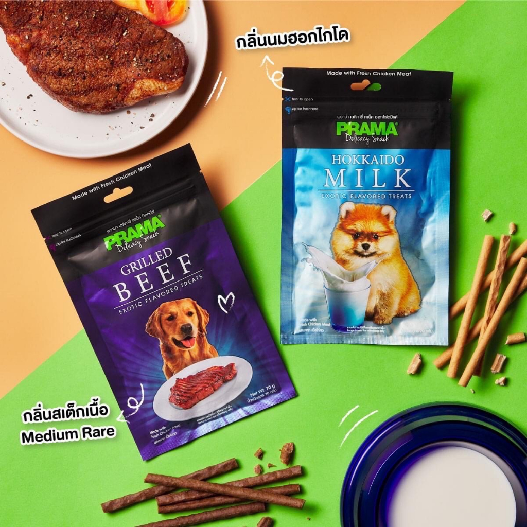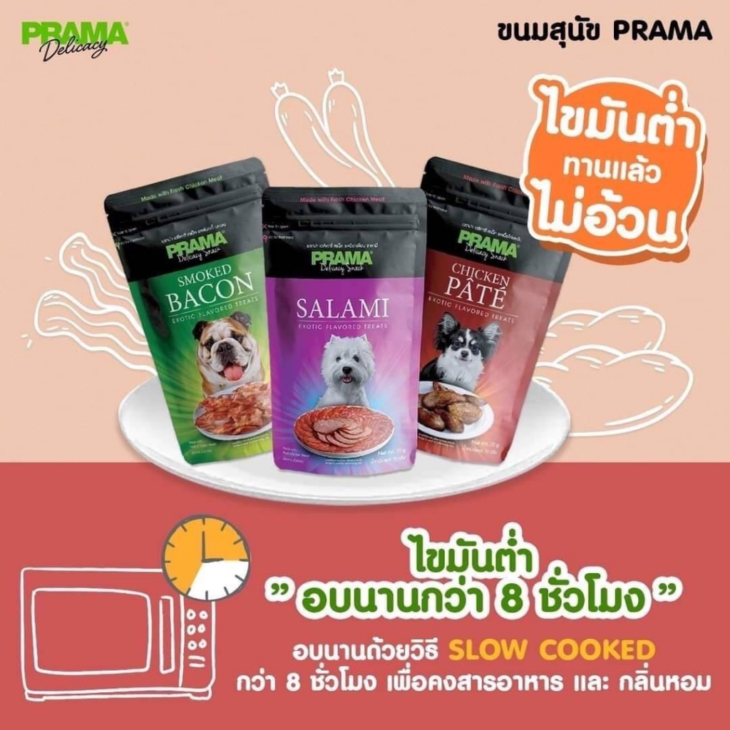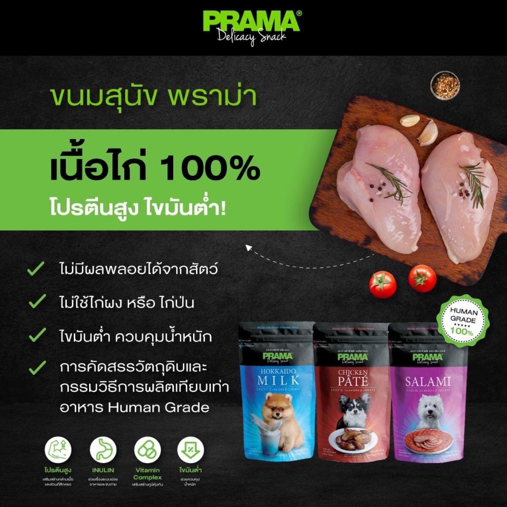 Prama พราม่า ขนมสุนัข Dog Snack ผลิตจากเนื้อไก่แท้ 50 - 70 กรัม ครบรส!!!ทำจากเนื้อไก่สดแท้ คุณภาพส่งออก มีเนื้อไก่ผสมมากกว่า 60%