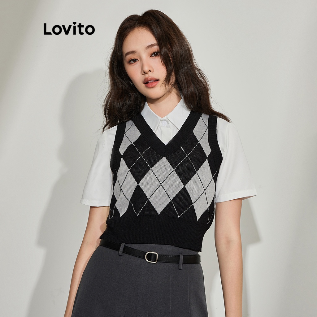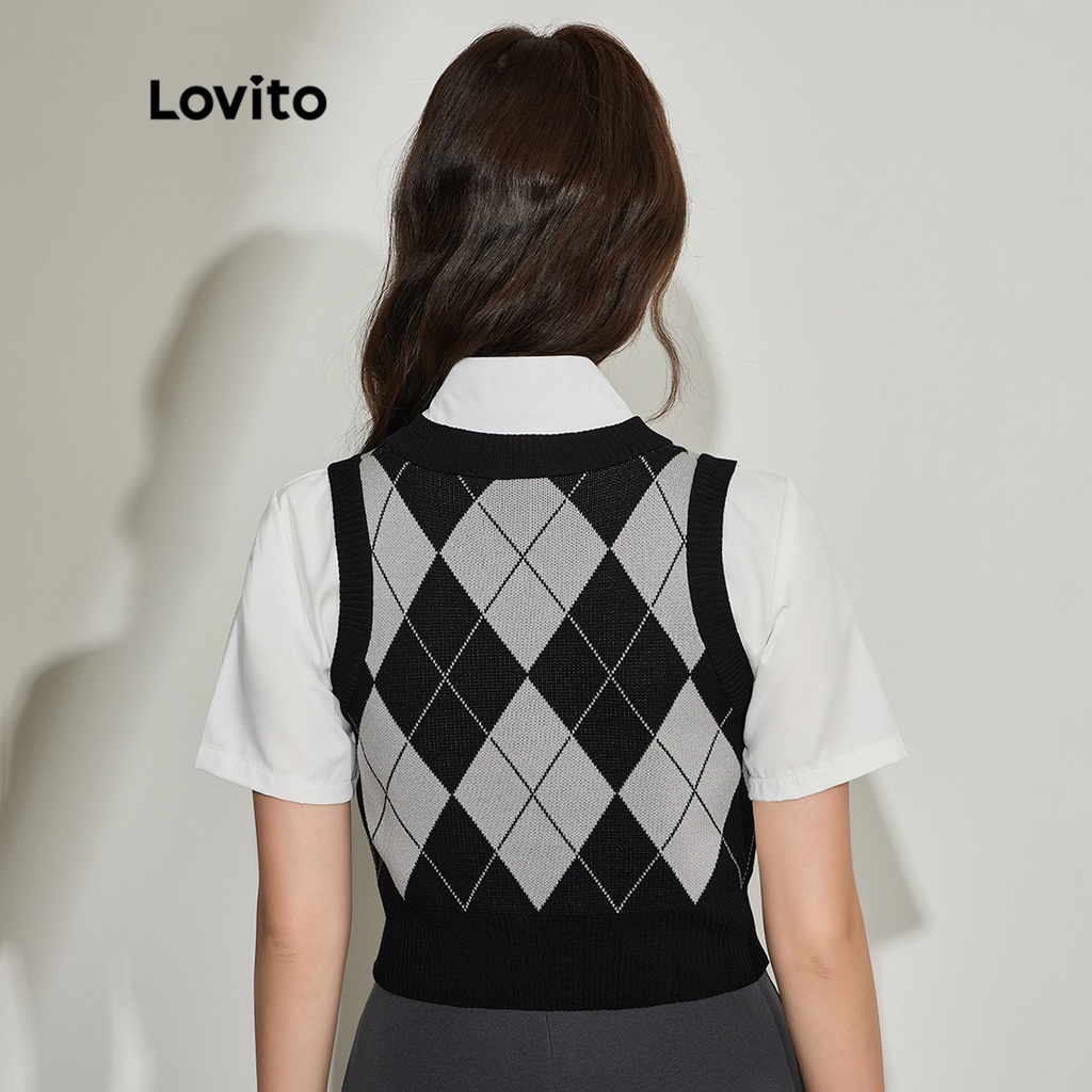 Lovito Áo len cardigan nữ vải gingham thường ngày l36ad068 (Trắng xanh dương)