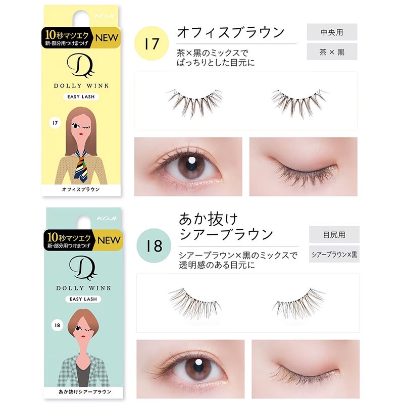 Cr.instagram.com/dolly_winkDOLLY WINK Easy Lash 1 Pair #No.17 ขนตาปลอม สุดฮิตจากประเทศญี่ปุ่น NO.17 ด้วยลุคสาวออฟฟิศ ด้วยการเล่นโทนสีน้ำตาลดำบริเวณปลายขนตา ดวงตาดูกลมโตอ่อนโยน ตัวขนตาปลอมออกแบบมาให้มีน้ำหนักเบา และตัวแกนขนตาปลอมสีใส เนียนไปกับผิวตา ติดง่าย เพียงทากาวที่แถมมาในกล่อง ตัวกาวแห้งไวใน 10 วินาที กันน้ำกันเหงื่อ ติดทนนานตลอดวัน