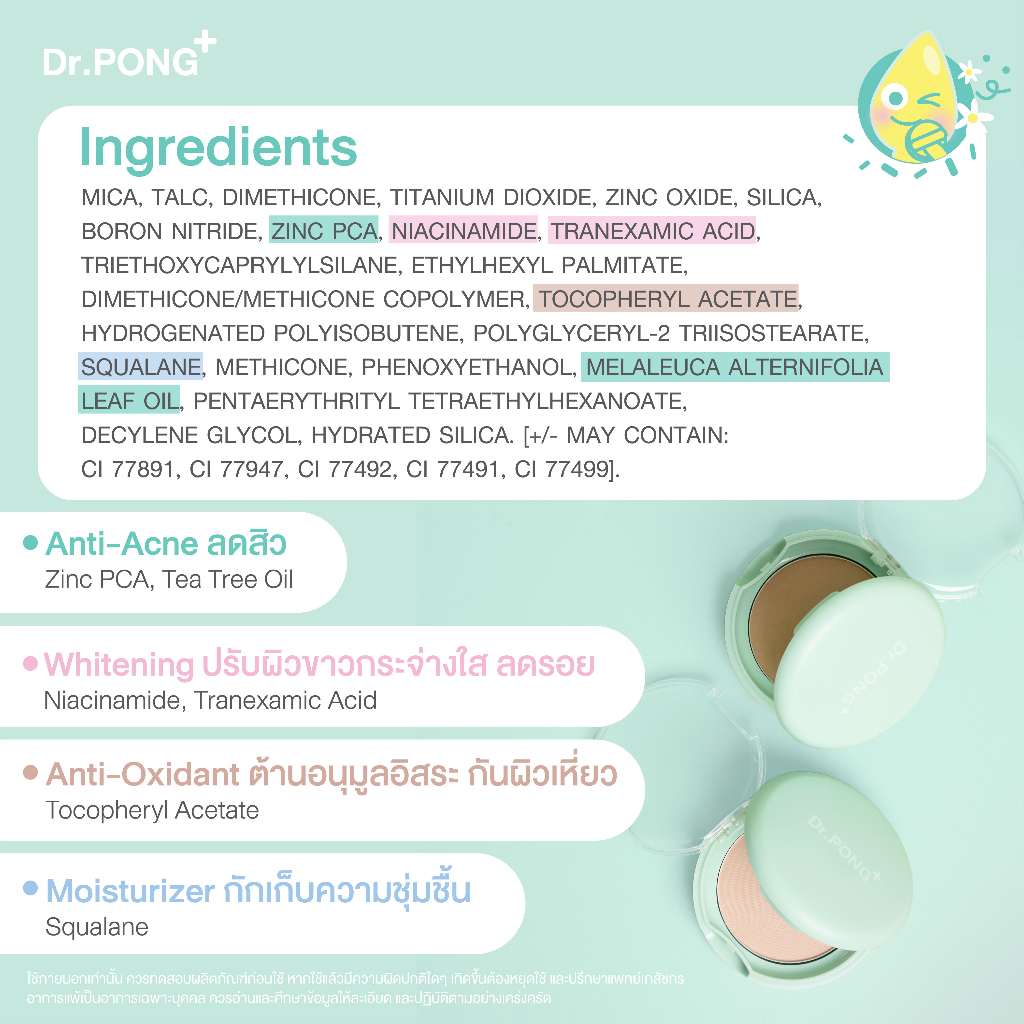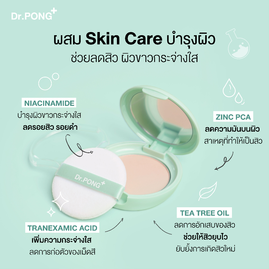 แป้งผสมรองพื้น สูตรสำหรับคนเป็นสิว เนื้อนุ่มฟู บางเบา ปกปิดทุกจุด คุมความมัน พร้อมส่วนผสมดูแลปัญหาสิว ได้แก่ Niacinamide, Zinc PCA, Tea tree oil