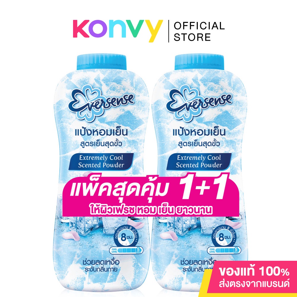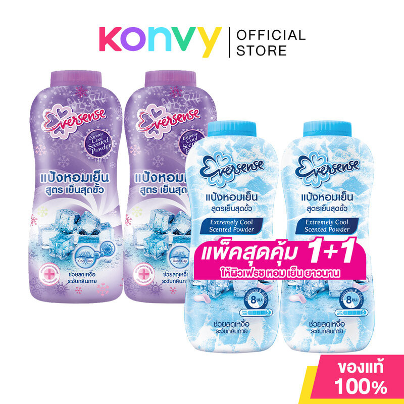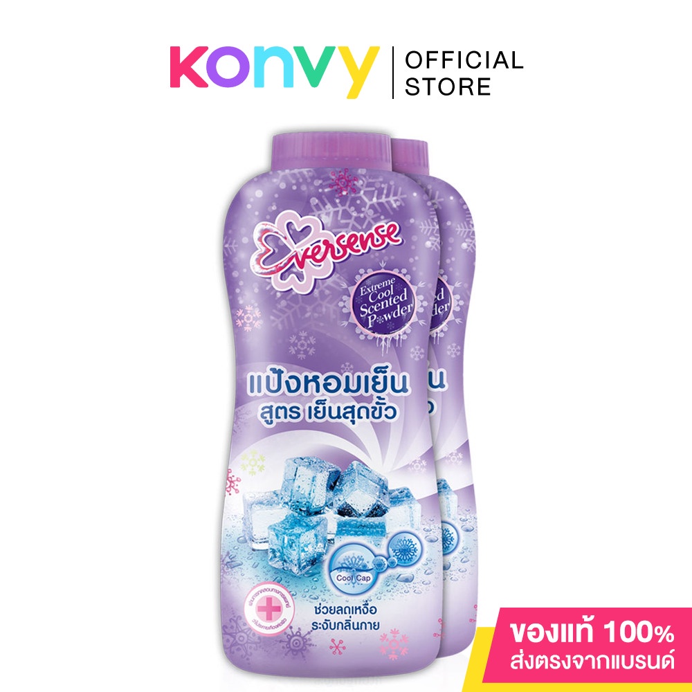 Eversense Extreme Scented Cooling Talcum [280g x 2pcs] [Blue/ Violet]แป้งหอมเย็นมากับเทคโนโลยีคูลแคปซูล ที่ช่วยเก็บความเย็นขั้นกว่า ช่วยให้สบายตัวตลอดวัน และยังช่วยระงับเหงื่อ ตัวการของสาเหตุกลิ่นกายด้วย Aldioza อีกทั้งได้รับการทดสอบทางการแพทย์ผิวหนัง ไม่ระคายเคืองผิว• หอมนาน ด้วยเทคโนโลยีคูลแคปซูลตัวเก็บความเย็น ทำให้เย็นยาวนาน สบายตลอดวัน