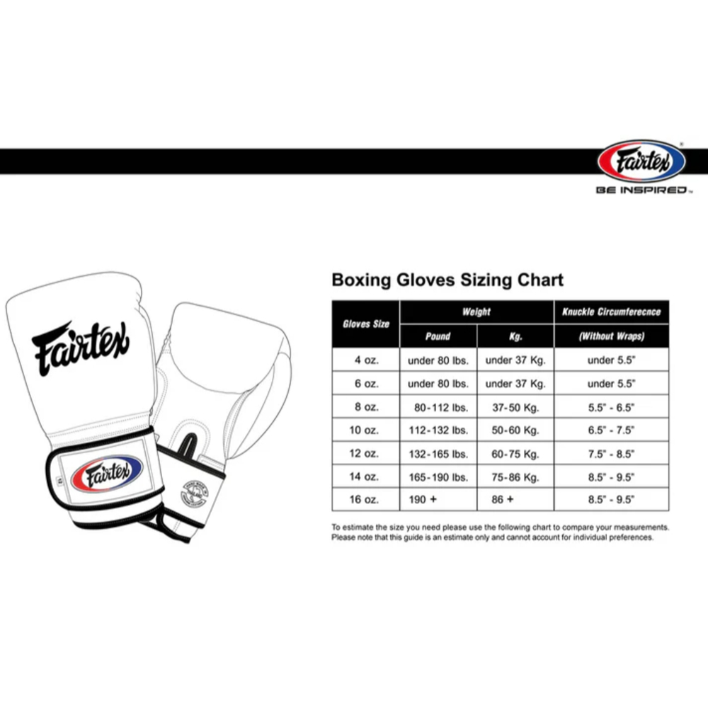 บรรจุภายในกล่อง: 1 คู่นวมชกมวย Fairtex สำหรับแข่งขันรุ่น BGL6 Pro มาพร้อมเชือกรัดตรงข้อมือเผื่อความกระชับ ออกแบบมาโดยเฉพาะสำหรับใช้ในการแข่งขันอย่างเป็นทางการ เช่น K-1 USA, K-1 Brazil, K-1 GP, ISKA, Strike Force, WBC มวยไทย และรายการชิงแชมป์ระดับโลกอื่นๆ