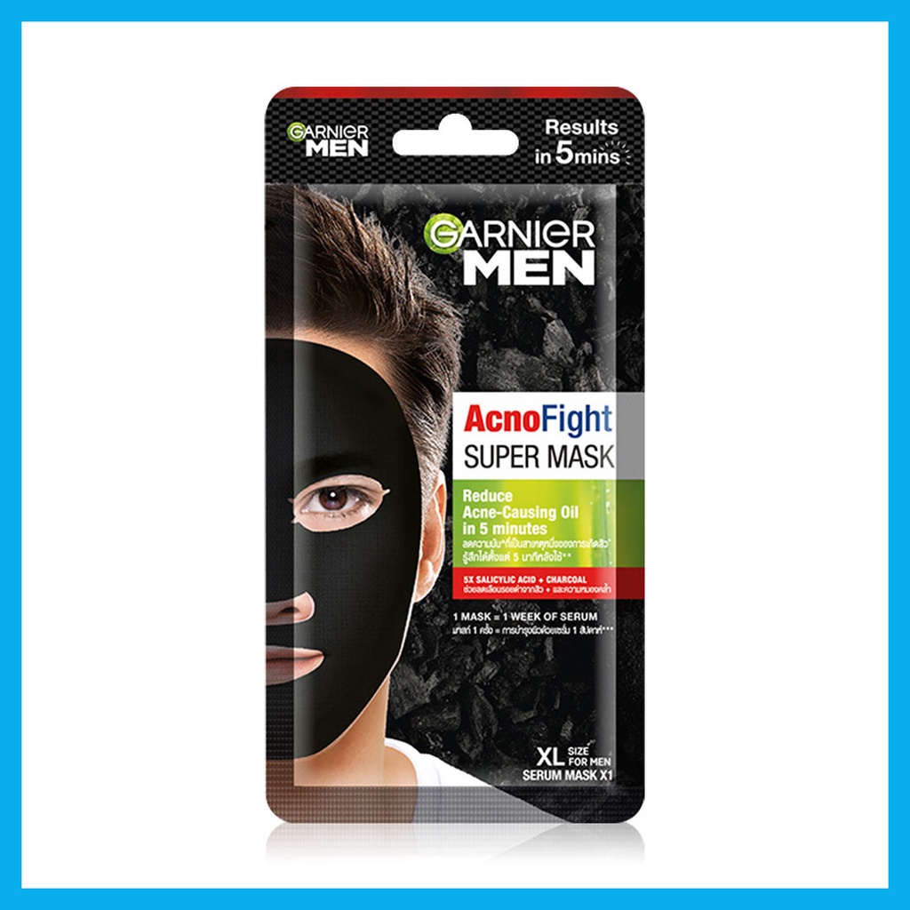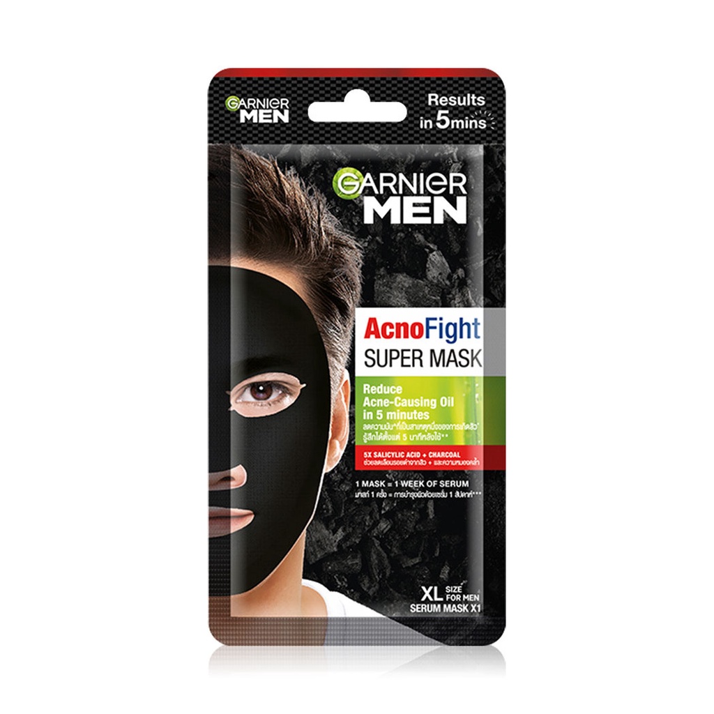 Garnier Men Acnofight Super Mask 28gแผ่นมาสก์ชาร์โคลขนาด XL ที่ออกแบบพิเศษให้เหมาะกับโครงหน้าผู้ชายโดยเฉพาะ สูตรเข้มข้น มาสก์ 1 ครั้งเสมือนการใช้เซรั่มบำรุงผิว ลดความมันที่ก่อให้เกิดสิว แผ่นมาสก์หน้าสีดำผสานพลังชาร์โคลที่เป็นที่ยอมรับว่ามีคุณสมบัติเสมือนการดีท็อกซ์ ช่วยดูดซับสิ่งสกปรกตกค้างและมลภาวะออกจากผิวหน้า และฟื้นบำรุงให้ผิวดูกระจ่างใสขึ้น• ออกแบบพิเศษให้เหมาะกับโครงหน้าผู้ชายโดยเฉพาะ