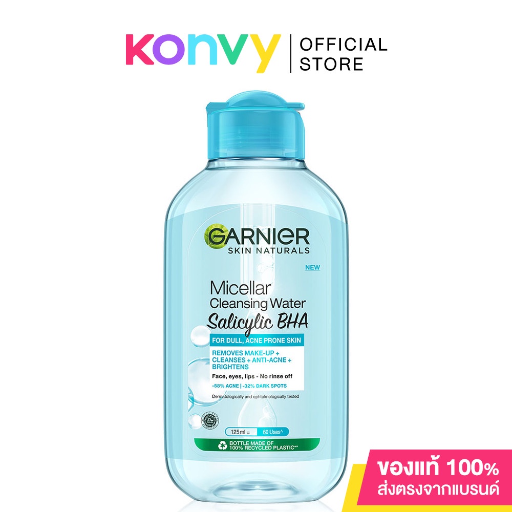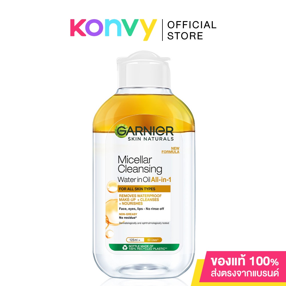 Garnier Micellar Cleansing Water Even for Sensitive Skin 125ml ผลิตภัณฑ์ทำความสะอาดผิวหน้า รอบดวงตา และริมฝีปาก สูตรสำหรับผิวธรรมดา-มีแนวโน้มแพ้ง่าย ด้วยไมเซล่าเทคโนโลยี ช่วยดูดจัดเมคอัพและสิ่งสกปรกเสมือนแม่เหล็ก ไม่ต้องถูรวมถึงทำความสะอาดฝุ่น PM2.5 ได้สะอาดหมดจด 99.99%• เนื้อสัมผัสแบบน้ำไม่เหนียวเหนอะหนะ
