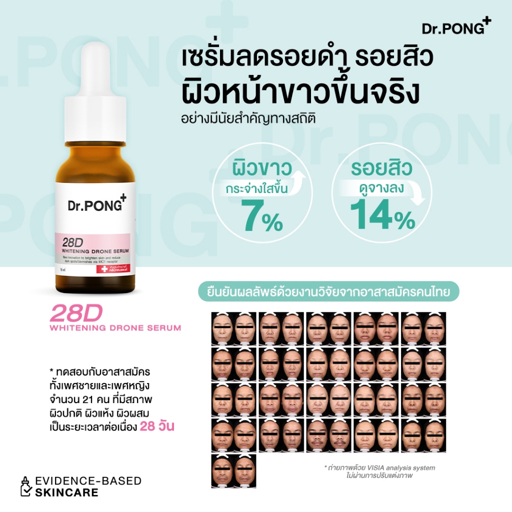 พร้อมส่วนผสมลดรอยจุดด่างดำจากสิว ผิวหน้าแลดูกระจ่างใสขึ้น ด้วย Dr.PONG 28D whitening drone