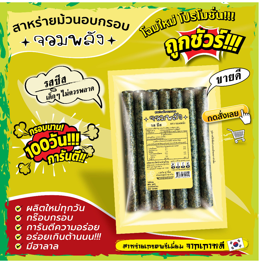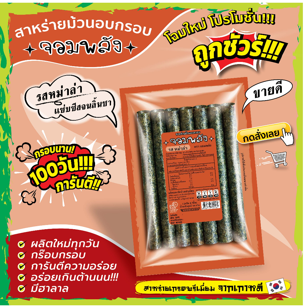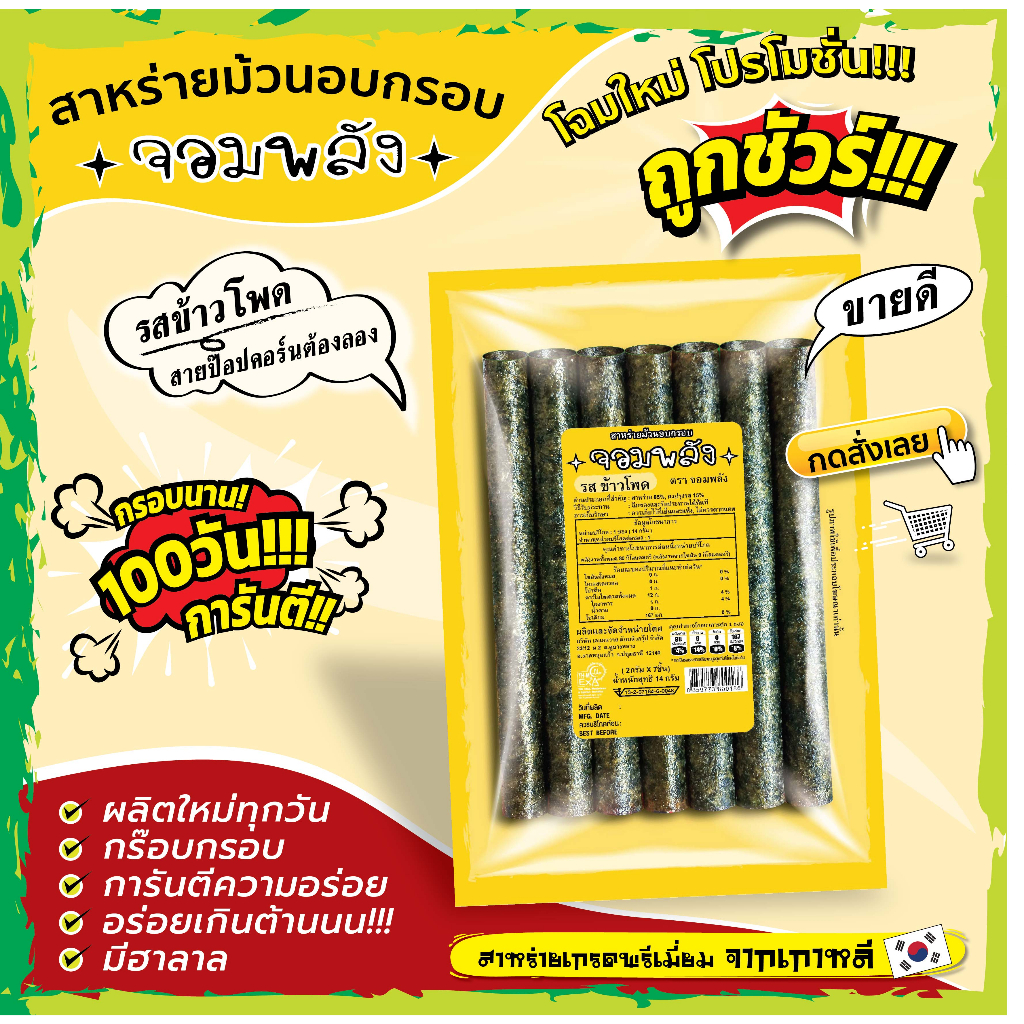 New!! แพคเกจใหม่ กรอบนาน100วันการันตี!! (หมดปัญหาสินค้าไม่กรอบ) *กดสั่ง15ห่อขึ้นไป 11บาท ถูกชัวร์กรอบบ๊านนน!!สาหร่ายม้วนอบกรอบตราจอมพลัง ถูกชัวร์11บาท สาหร่ายนำเข้าจากเกาหลี ไขมัน0% มีฮาลาล