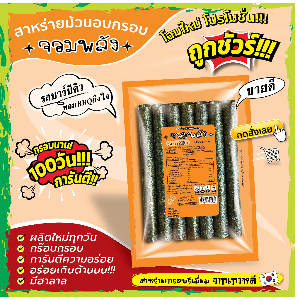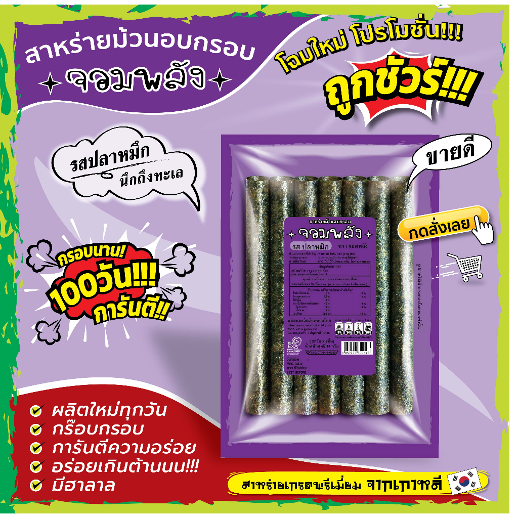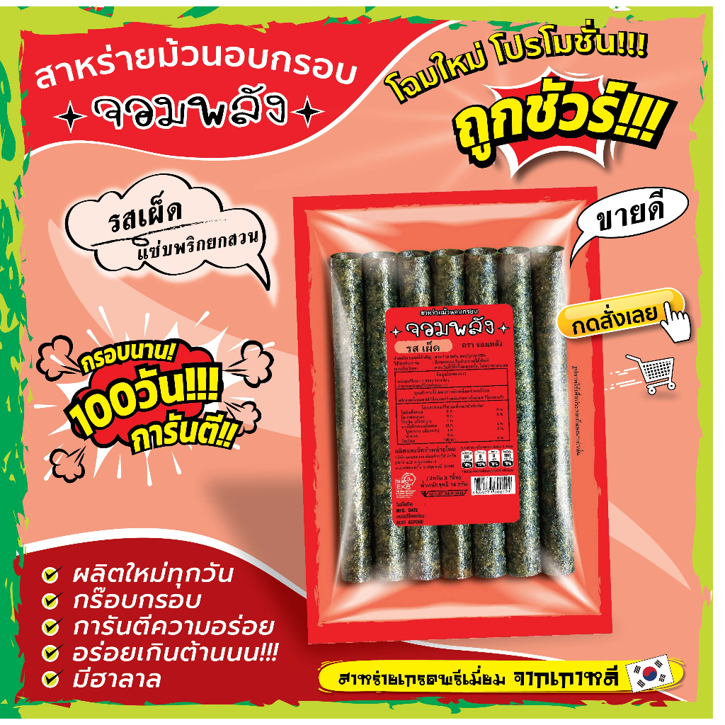 New!! แพคเกจใหม่ กรอบนาน100วันการันตี!! (หมดปัญหาสินค้าไม่กรอบ) *กดสั่ง15ห่อขึ้นไป 11บาท ถูกชัวร์กรอบบ๊านนน!!สาหร่ายม้วนอบกรอบตราจอมพลัง ถูกชัวร์11บาท สาหร่ายนำเข้าจากเกาหลี ไขมัน0% มีฮาลาล