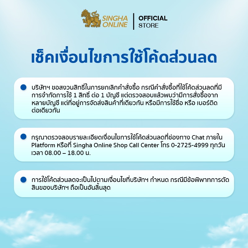 • กรุณาตรวจสอบรายละเอียดเงื่อนไขการใช้โค้ดส่วนลดที่ช่องทาง Chat ภายใน Platform หรือที่ Singha Online Shop Call Center โทร 0-2725-4999 ทุกวัน เวลา