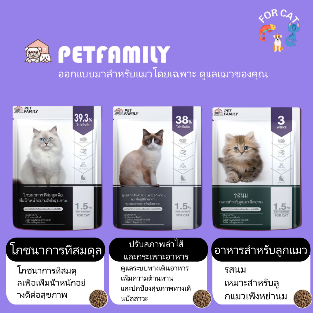 ทีมโภชนาการสัตว์ของ Pet Family ได้สร้างสรรค์อาหารที่เหมาะกับแมวแต่ละช่วงวัย