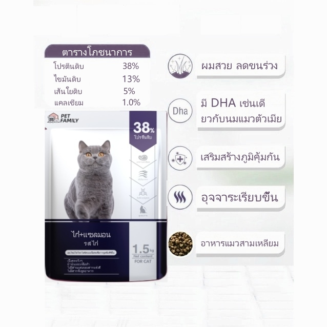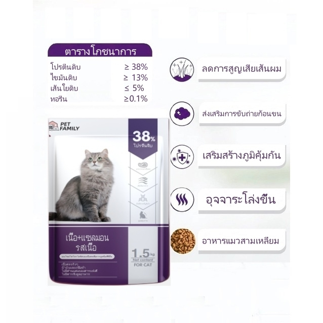 อาหารแมว Pet Family ผลิตโดยโรงงานระดับโลกและได้รับการรับรองจาก Pet Food Nutrition Authority ของสหรัฐอเมริกา (AAFCO) ควบคุมส่วนผสมทั้งหมดเช่นความเค็มของอาหารเพื่อให้แน่ใจว่าไม่ส่งผลเสียต่อไตของแมว