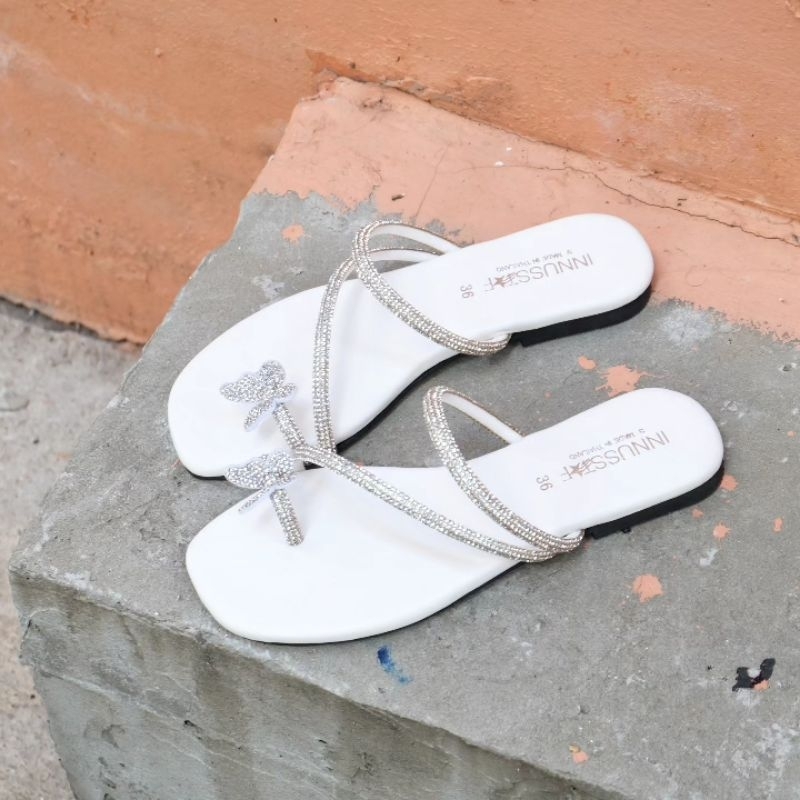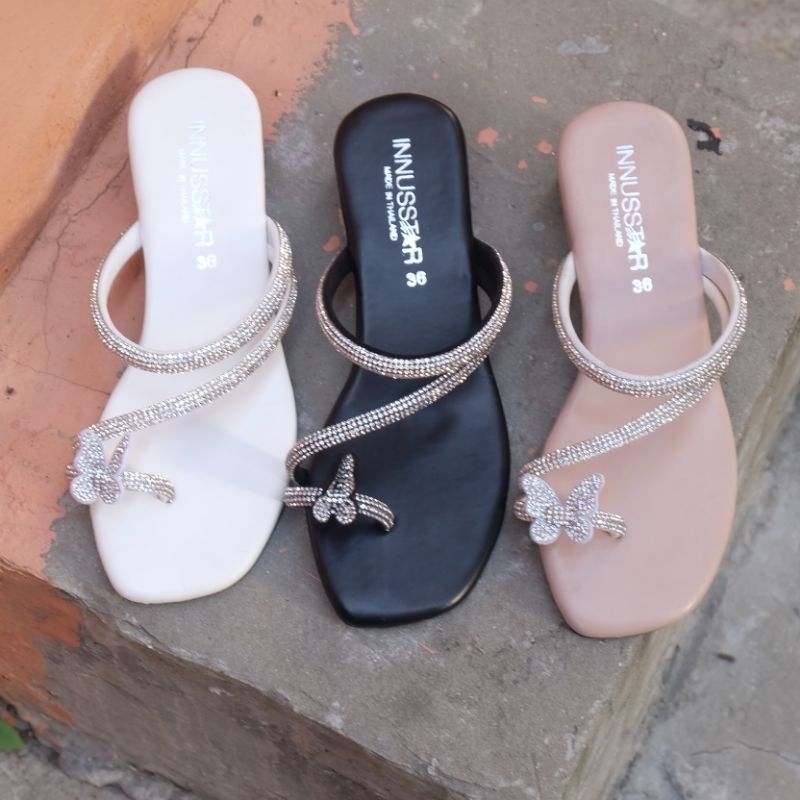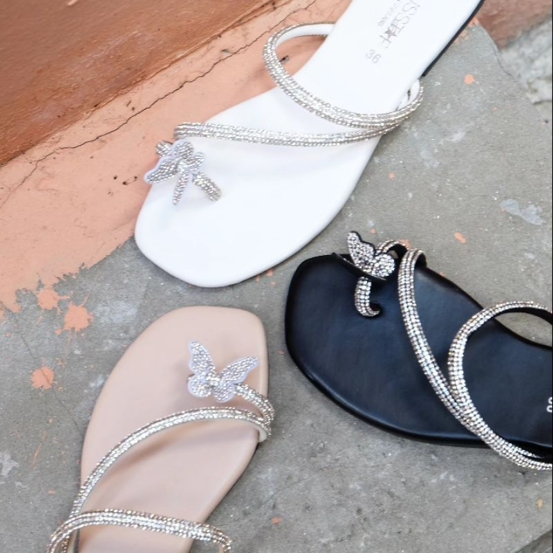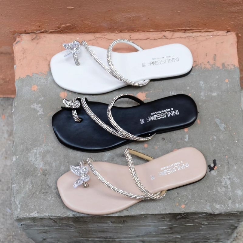 รองเท้าแตะหน้าสวมสายไขว้แต่งเพรชลายผีเสื้อ งานสวยเก๋ไม่ซ้ำใคร