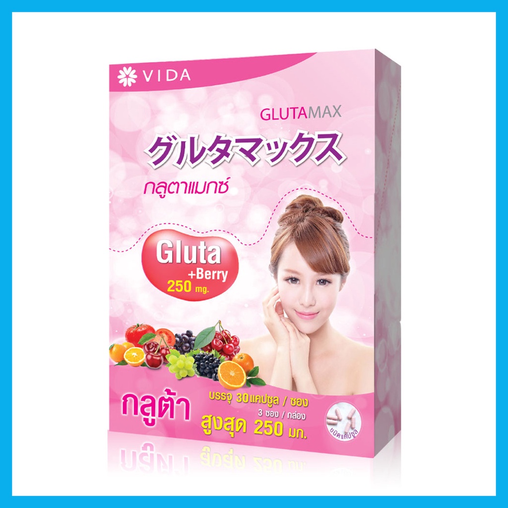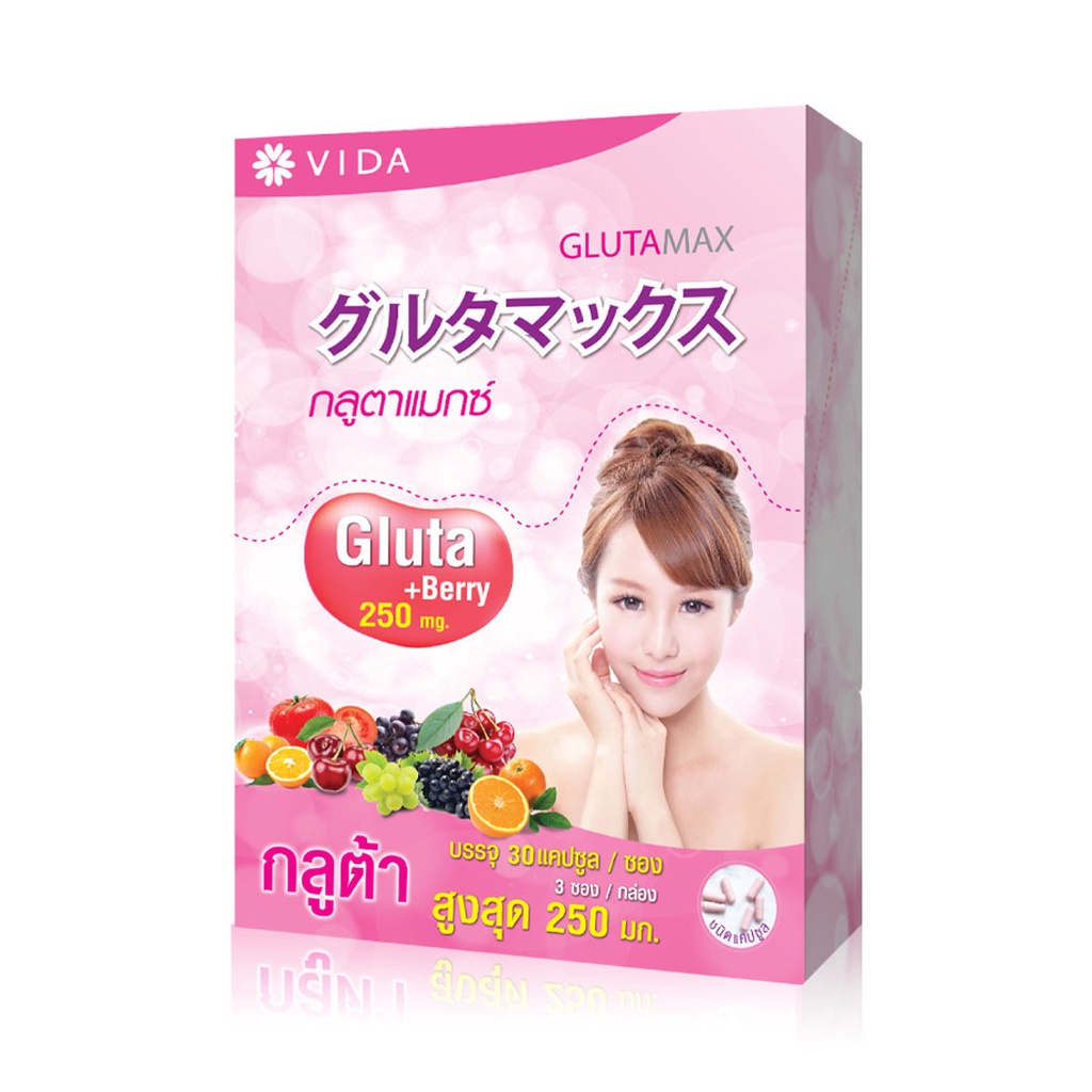 GlutaMax by VidaGluta Berry+ 250mg [30 Capsules x 3 Sachets] ผลิตภัณฑ์เสริมอาหารในรูปแบบแคปซูลที่มีส่วนประกอบจากแอล-กลูต้าไธโอน นำเข้าจากประเทศญี่ปุ่น และวัตถุดิบคัดสรร ได้แก่ วิตามินซี, กรดอัลฟาไลโปอิค, สารสกัดจากเปลือกสน, ซิงค์ และสารสกัดจากผลไม้ต่างๆ ได้แก่ ส้ม มะเขือเทศ และเมล็ดองุ่นส่วนประกอบ