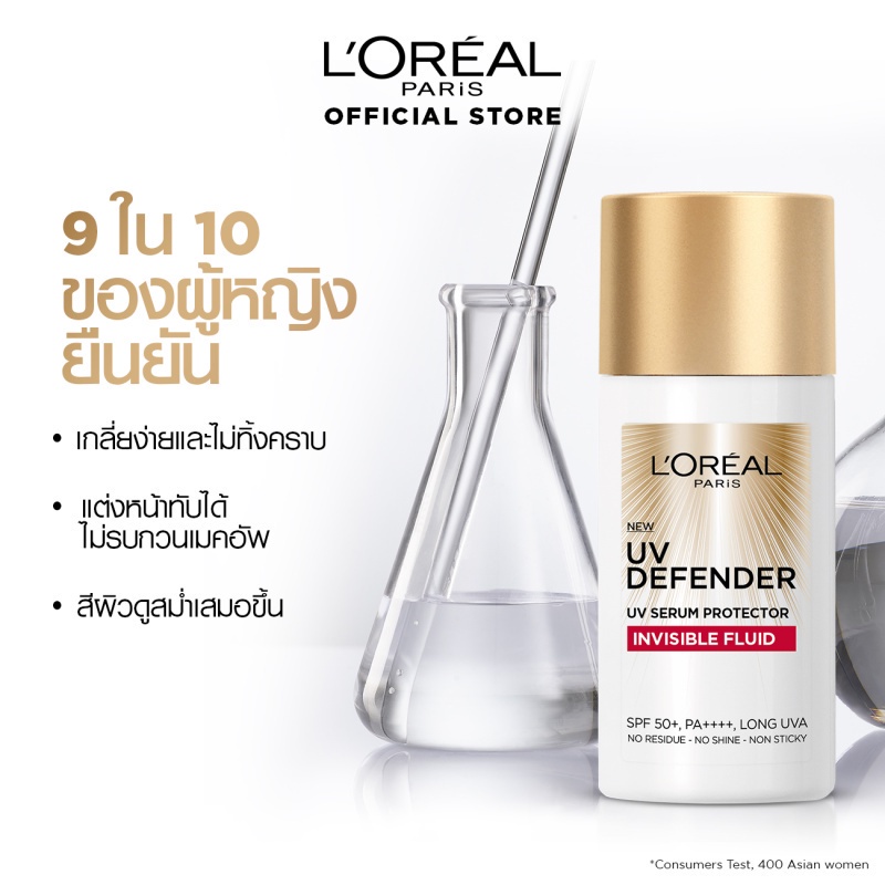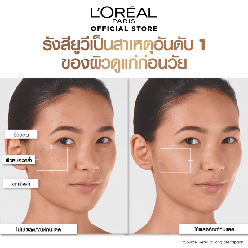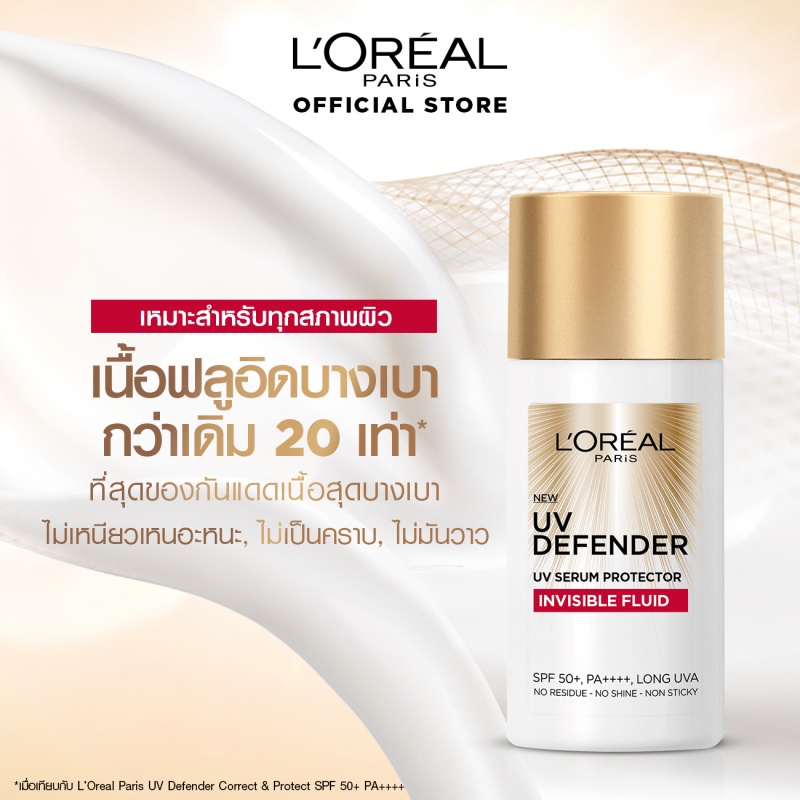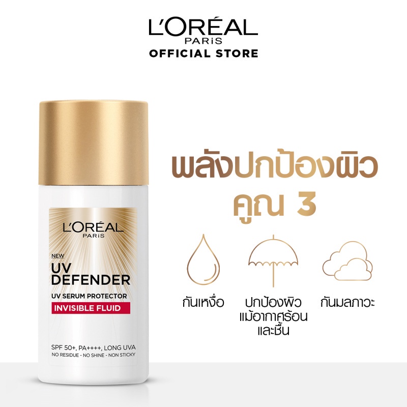 รายละเอียดผลิตภัณฑ์ / PRODUCT DESCRIPTIONผลิตภัณฑ์ป้องกันแสงแดดสำหรับผิวหน้า เซรั่มกันแดดสูตรบางเบา ใช้ได้ทุกวัน ปกป้องริ้วรอยก่อนวัยจากแสงแดด การปกป้องยูวี : ด้วยกันแดด เดลี่ บรอด-สเปคตรมั (Daily board-spectrum) ที่มอบการปกป้องขั้นสุดด้วย เอสพีเอฟ 50+ และปกป้องผิวจาก Long UVA ที่ปกป้องผิวจากสัญญาณริ้วรอยก่อนวัยที่เกิดจากรังสียูวี ทั้งจุดด่างดำ^ผิวหมองคล้ำ^และริ้วรอย^ กันแดดเนื้อฟลูอิด : ไม่เหนี่ยว ผิวไม่มันเยิ้ม ซึมซาบเร็ว มอบสัมผัสที่บางเบา ด้วยเทคโนโลยี Netlock เอกสิทธิ์เฉพาะของลอรีอัล ปรารีส ช่วยล็อคประสิทธิภาพ เสมือนเกราะปกป้องผิวจากรังสียูวี และให้ผลลัพท์โดยไม่ทิ้งคราบขาว กันแดดติดทนนาน: เทคโนโลยี Netlock เอกสิทธิ์เฉพาะที่มีเนื้ออนูเล็กขนาดไมโคร (Micro-Droplets) เสมือนฟิล์มยึดเกาะผิวที่ให้ประสิทธิภาพสูง สามารถทนน้ำ และปกป้องผิวจากมลภาวะและฝุ่นได้เหตุผลที่คุณจะหลงรัก / WHY YOU WILL LOVE ITผิวได้รับการปกป้องจากรังสียูวี และปกป้องจากสัญญาณผิวแก่ก่อนวัยจากแสงแดด ทั้งริ้วรอย^ จุดด่างดำ^ และผิวหมองคล้ำ^