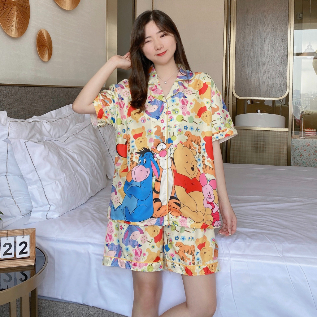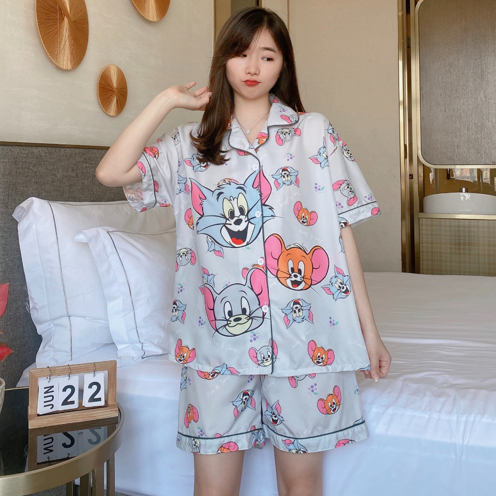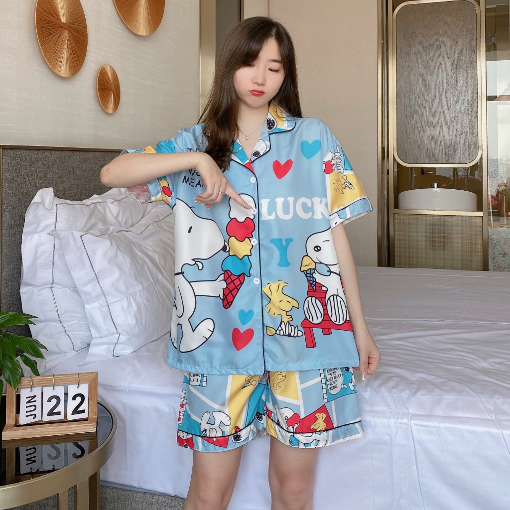 Áo ngủ lụa ý cỡ lớn đồ ngủ lụa mỏng tay dài hoạt hình ngắn tay mặc thường ngày