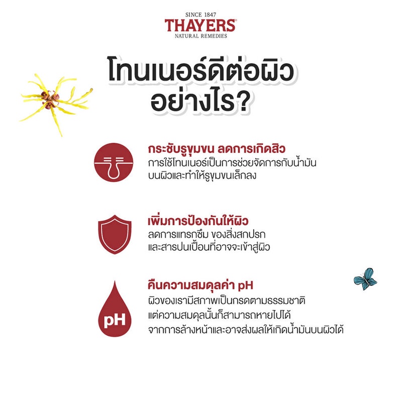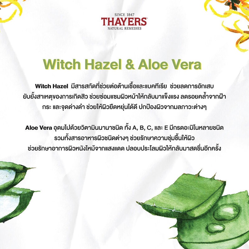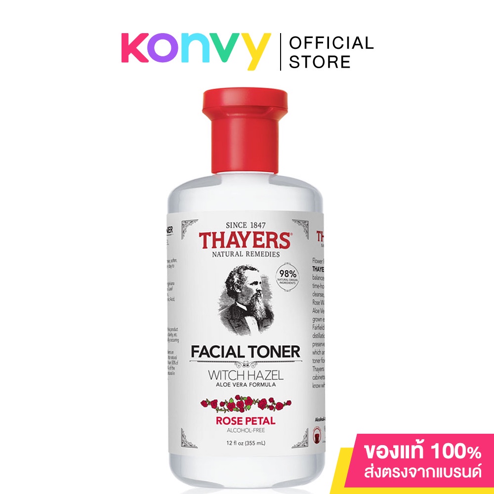 Thayers Rose Witch Hazel Toner 355mlโทนเนอร์รุ่นยอดนิยมสูตรกลีบกุหลาบ สูตรเพื่อผิวผสมและผิวขาดน้ำอุดมไปด้วยน้ำมันตามธรรมชาติและวิตามินซี ทำความสะอาดผิวอย่างอ่อนโยน พร้อมทั้งช่วยฟื้นฟูสภาพผิวที่หมองคล้ำและอิดโรย คืนความกระจ่างใส เปล่งปลั่ง ลดเลือนรอยสิวและจุดด่างดำให้แลดูจางลง พร้อมด้วยส่วนผสมหลักจากวิชฮาเซล (Witch Hazel) และว่านหางจระเข้ มีคุณสมบัติในการลดการอักเสบของสิว ลดความมันส่วนเกิน ขจัดสิ่งสกปรกเพื่อลดการอุดตัน กระชับรูขุมขนให้เล็กลง มอบสัมผัสเย็นสบาย เติมเต็มความสดชื่นได้อย่างล้ำลึก• โทนเนอร์สูตรกลีบกุหลาบสูตรเพื่อผิวผสมและผิวขาดน้ำ