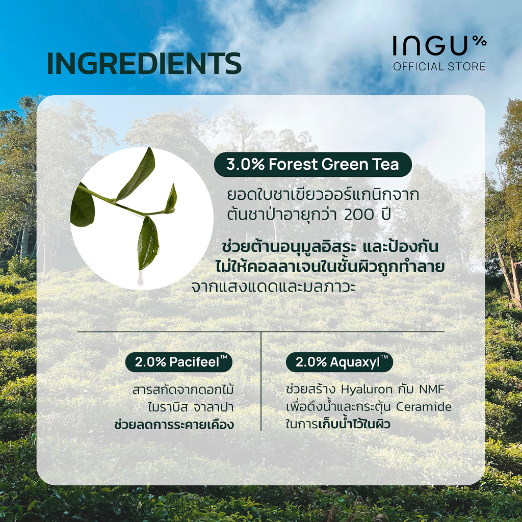 ยอดใบชาเขียวออร์แกนิกจากต้นชาป่าอายุกว่า 200 ปี เด็ดด้วยมือที่จังหวัดเชียงราย อุดมไปด้วยสารต้านอนุมูลอิสระเข้มข้นอย่าง Epigallocatechin Gallate (EGCG), Caffeine และ Catechin ช่วยต้านอนุมูลอิสระและป้องกันไม่ให้คอลลาเจนในชั้นผิว ถูกทำลายจากแสงแดดและมลภาวะ