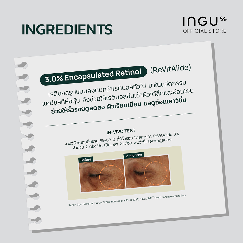 เรตินอลรูปแบบคงทนกว่าเรตินอลทั่วไป มาในนวัตกรรมแคปซูลที่ห่อหุ้มและช่วยให้เรตินอลซึมเข้าผิวได้ลึกและอ่อนโยน ช่วยให้ริ้วรอยดูลดลง ผิวเรียบเนียนและดูอ่อนเยาว์ขึ้น