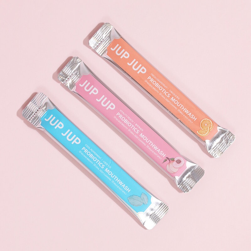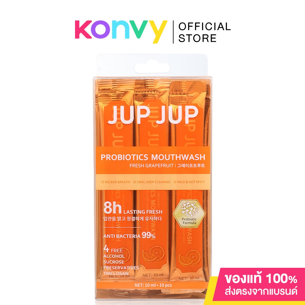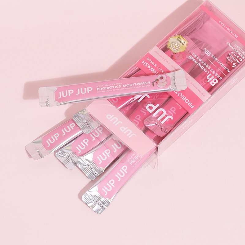JUP JUP Probiotics Mouthwash [10ml x 10pcs] #Vitality Peach เพิ่มความมั่นใจระหว่างวันด้วยน้ำยาบ้วนปาก กลิ่นพีช 10ซอง สำหรับพกพา ช่วยทำความสะอาดช่องปาก ลดการสะสมของแบคทีเรีย 99.9% มอบลมหายใจหอมสดชื่นยาวนาน 8 ชั่วโมง• แบบซองใช้งานง่าย พกพาสะดวก