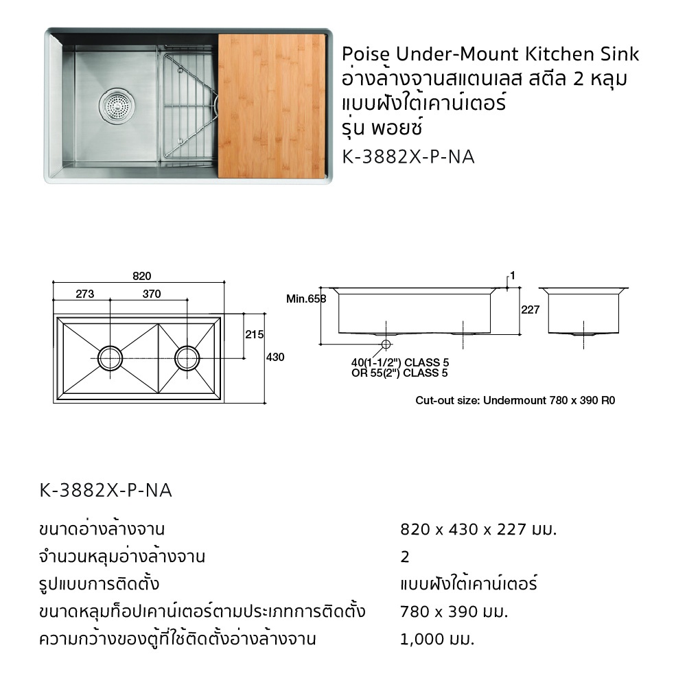 แบบฝังใต้เคาน์เตอร์พร้อมข้อต่อนํ้าทิ้งแบบลงพื้น, ท่อนํ้าล้นในตัว, สะดืออ่างแบบคลิ๊ก,อุปกรณ์ติดตั้ง, เขียง และตะกร้า