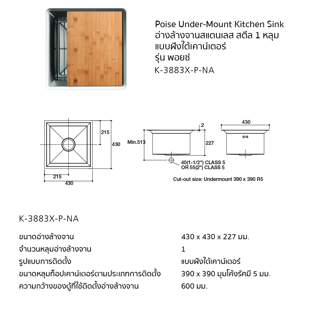 ขนาดเจาะฝังใต้เคาน์เตอร์ : 390 x 390, R5 mm